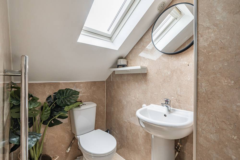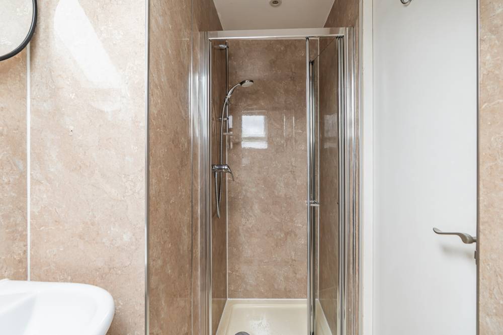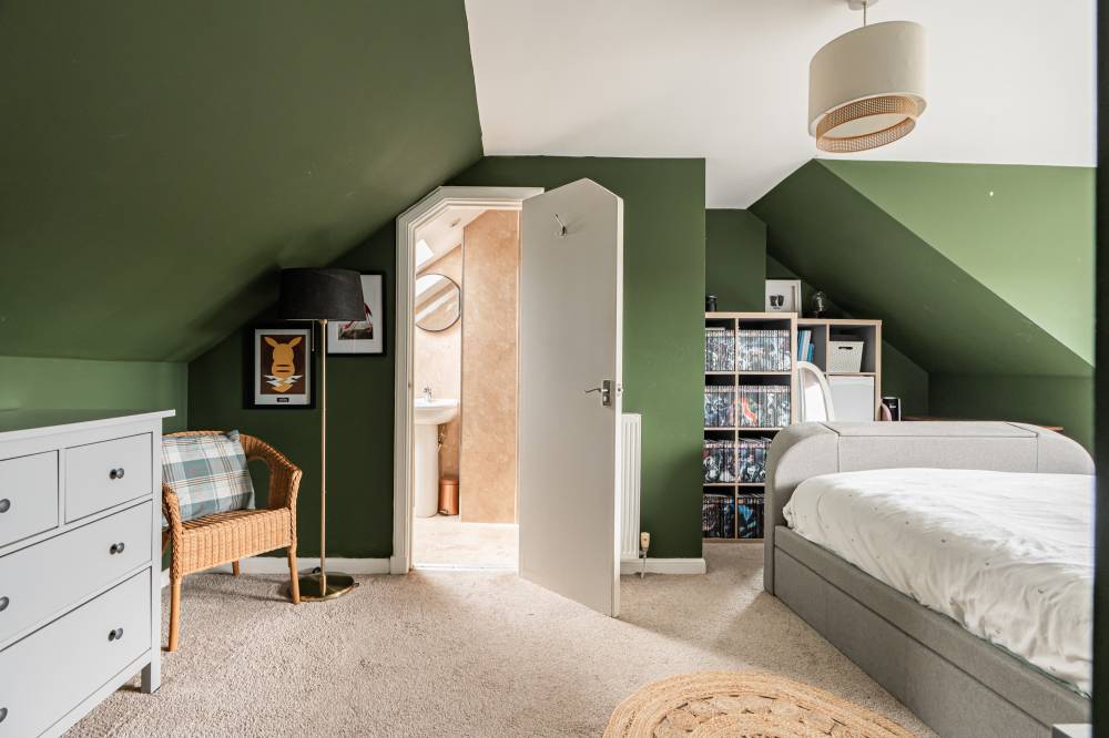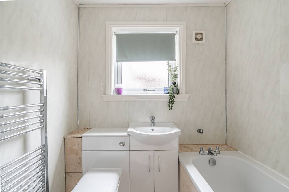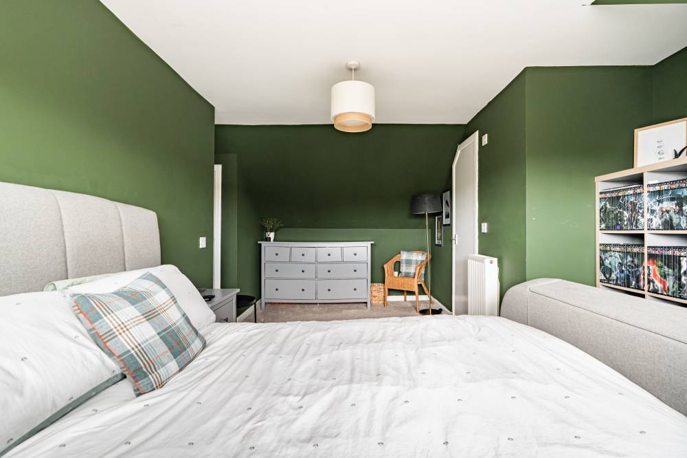 The property is approached via a welcoming vestibule, leading into a bright and generously sized reception room. With a front-facing aspect, fitted carpet, and ample space for both seating and dining, this room forms a comfortable hub for everyday living and entertaining. To the rear, a well-appointed kitchen is fitted with a range of wall and base units, an integrated oven, hob and dishwasher alongside a charming ceramic Belfast sink. Double-glazed doors open directly onto the rear garden, creating a natural flow between indoor and outdoor spaces. The ground floor also hosts a well-proportioned double bedroom, enjoying a tranquil rear aspect, as well as the main bathroom. The bathroom is fitted with a modern three-piece suite and finished with full wet-wall acrylic panels for a contemporary, low-maintenance design. Upstairs, the principal bedroom is a particularly appealing feature of the home, offering generous proportions, an en-suite shower room, and stunning far-reaching views across open fields to the rear.