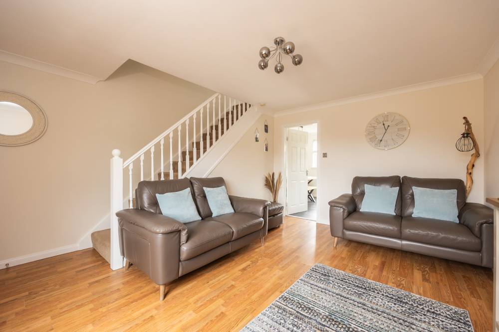 Offered to the market in move-in condition, the light-filled accommodation comprises; welcoming vestibule opening into an attractive front-facing lounge with open plan carpeted staircase to the upper landing. The recently upgraded contemporary kitchen / diningroom features a door leading directly to the private garden. The integrated kitchen is fitted with stylish wall and base units and within the dining area there is a useful under-stair cupboard providing additional storage provisions. Upstairs, two well-proportioned double bedrooms with built-in wardrobes are complemented by a sleek modern bathroom with a white three-piece suite and shower over the bath. Further benefits include double glazing and gas central heating, with recently upgraded combi boiler.