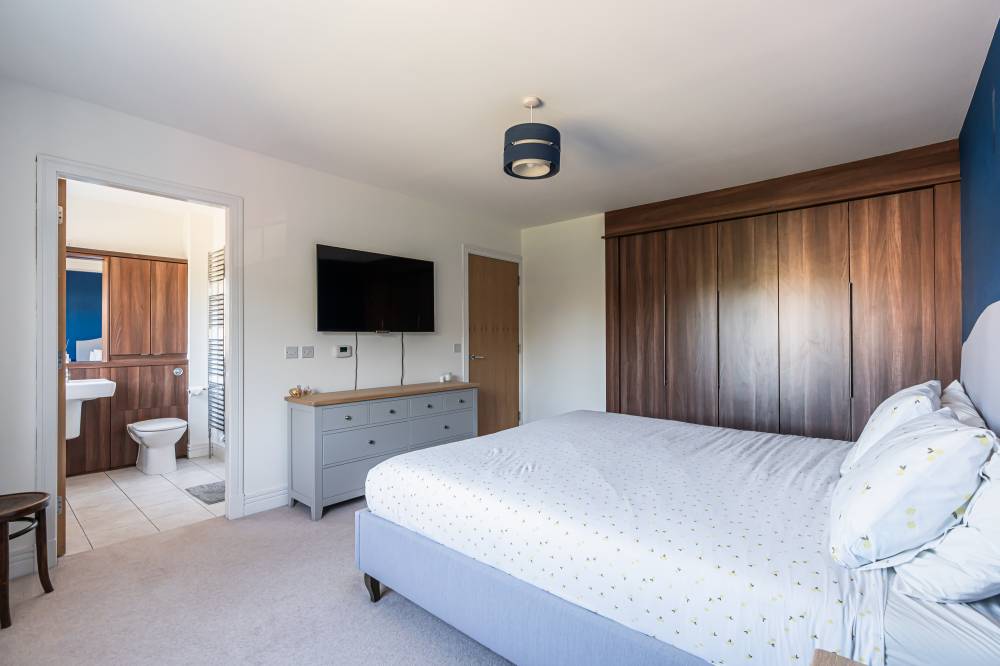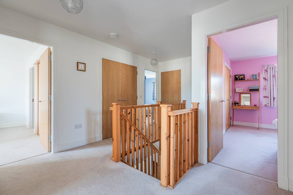 On entering the home, a welcoming vestibule with useful storage leads into a bright hallway, where double doors open to a beautifully proportioned reception room at the front. To the rear, the heart of the home is the superb open plan dining kitchen, a wonderful space for family life and entertaining, with French doors opening directly to the garden. The kitchen is fitted with a full range of integrated appliances, enhanced by a walk-in pantry for excellent storage. A separate utility room provides further convenience, with space for laundry appliances and direct access to the integral garage. Upstairs, a striking galleried landing creates an airy sense of space and includes two generous storage cupboards along with access to a large loft. The principal bedroom is a stylish retreat with fitted wardrobes and a luxurious en-suite shower room with contemporary vanity storage. The second double bedroom also benefits from its own en-suite, while two further doubles with built-in wardrobes and a versatile fifth bedroom/home office are served by a sleek four-piece family bathroom complete with walk-in shower. Benefits include gas central heating and full double glazing.