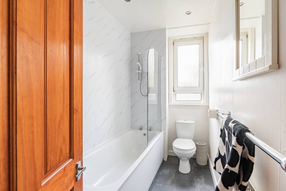 A welcoming hallway with a generous storage cupboard leads into a bright and spacious lounge/diner, offering plenty of room for both relaxing and entertaining. The adjoining kitchen is fitted with a range of integrated and freestanding white goods, complemented by under-unit lighting, partial tiling in splash areas, and a breakfast hatch connecting to the living space – adding a sociable touch. The rear-facing double bedroom enjoys lovely open views towards Corstorphine Hill and benefits from a large integrated closet with mirrored sliding doors, shelving, and hanging rails. The bathroom is partially panelled and fitted with a shower-over-bath.