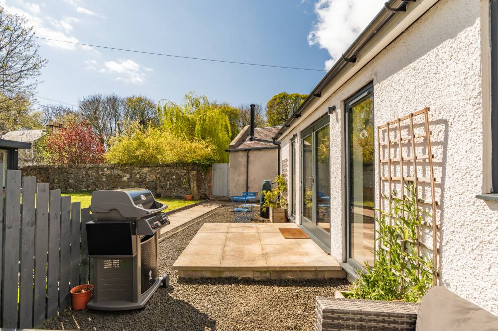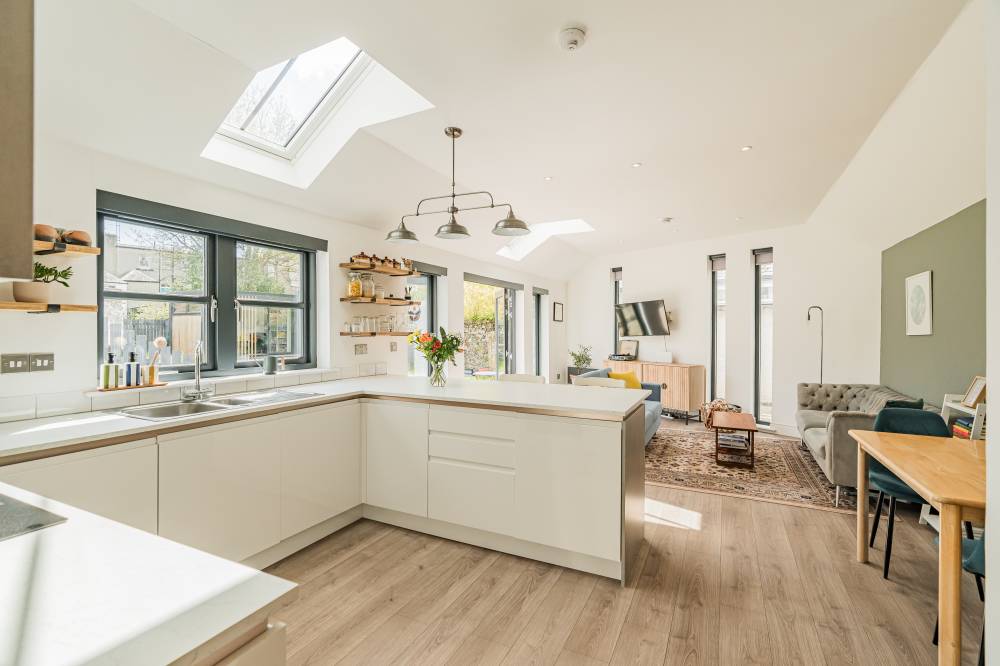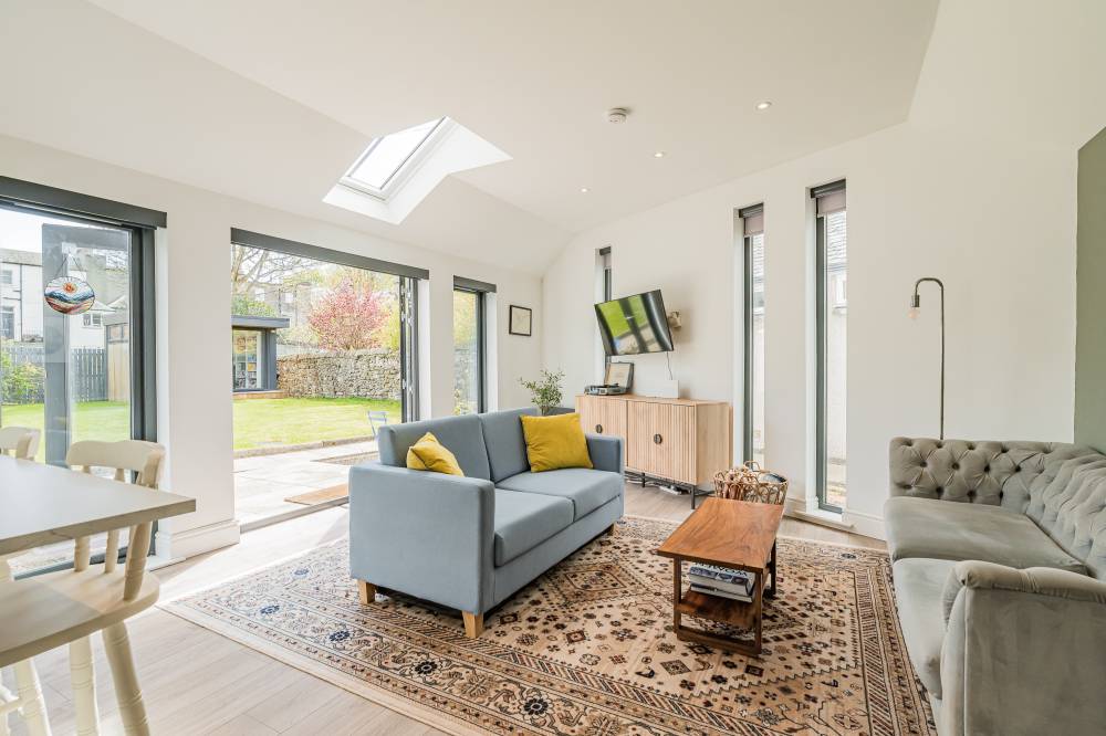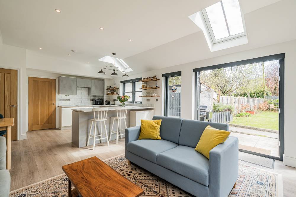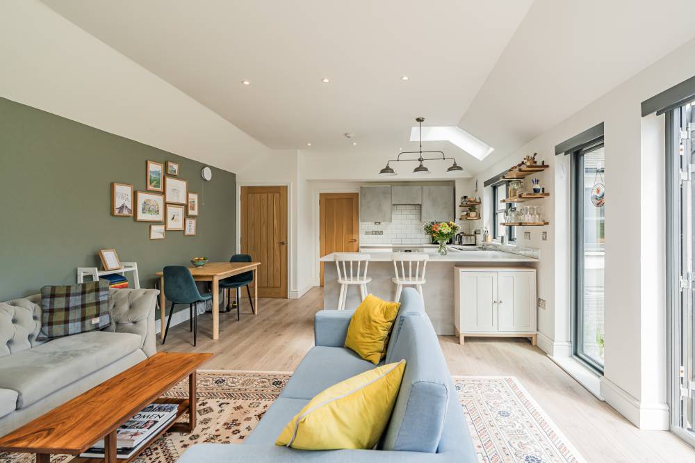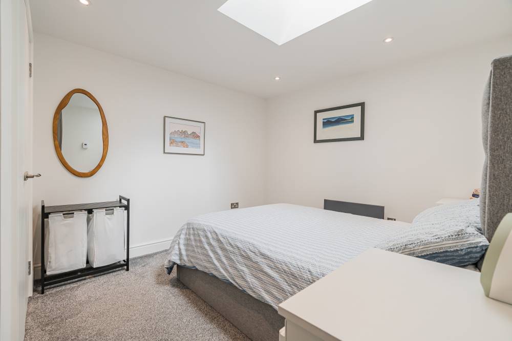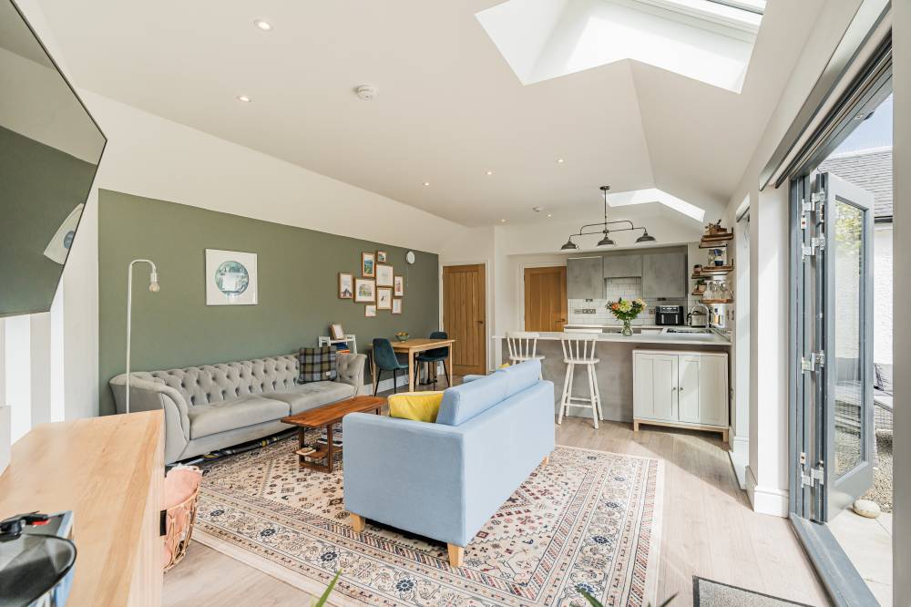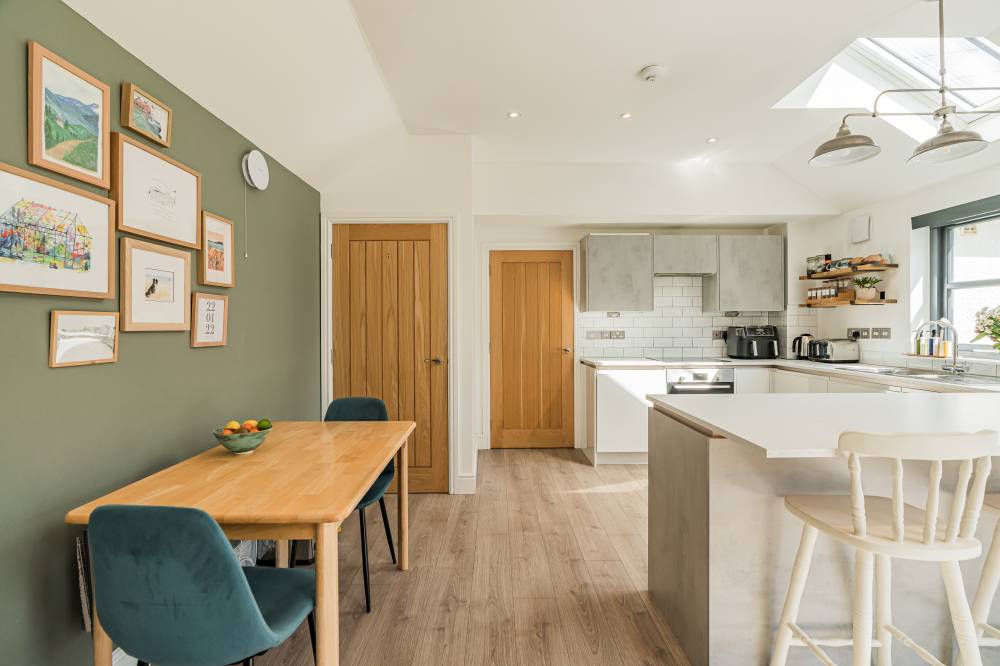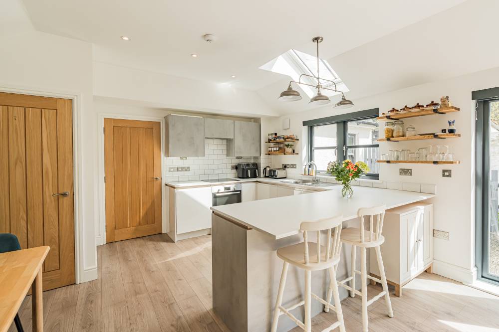 Accessed via a gated lane off the High Street, the property enjoys a peaceful and private setting. A pathway leads to the front entrance and continues around to the rear garden. Inside, a central hallway connects all rooms. The heart of the home is an impressive open-plan kitchen and living space, flooded with natural light from large south-facing windows and overhead Velux skylights. Patio doors open directly onto the garden, creating a seamless indoor-outdoor flow. The space is finished in a fresh, contemporary style, with crisp white décor and quality finishes throughout.