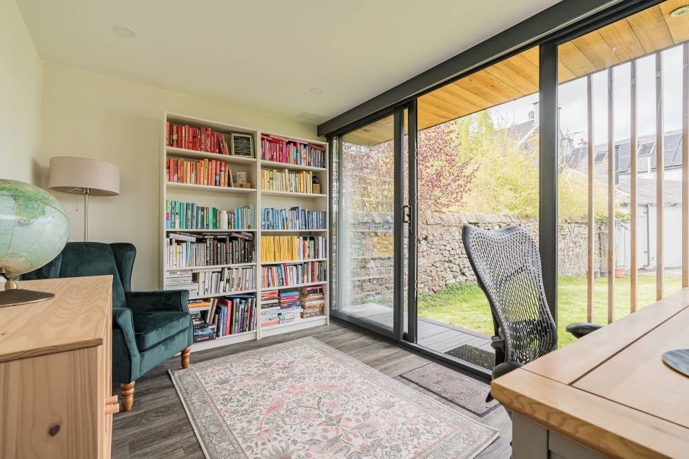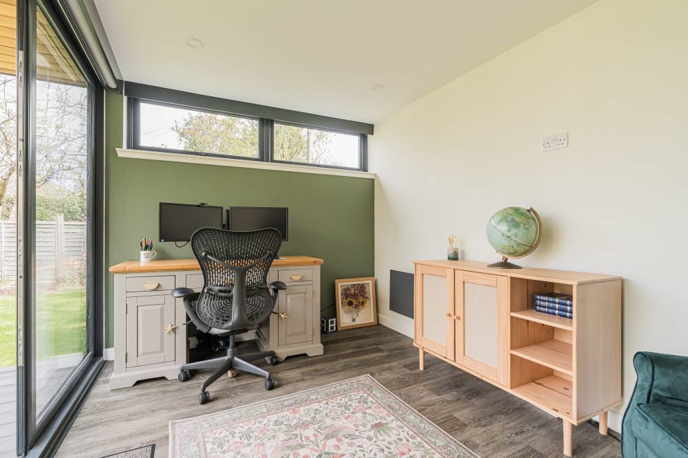 Externally, the property benefits from a beautifully maintained, enclosed south-facing garden, offering a mix of lawn and patio space. A standout feature is the contemporary garden pod, ideal for use as a home office, studio, gym, or guest accommodation. The sheltered patio area provides the perfect setting for outdoor dining and entertaining.