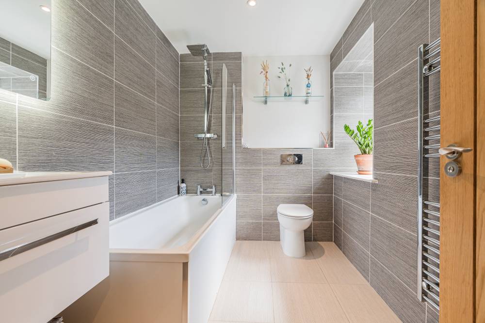 Both double bedrooms are comfortably proportioned, complete with built-in wardrobes and soft carpeting. A stylish bathroom is positioned off the hallway and includes a bath with overhead shower, WC, vanity basin with storage, LED mirror, and a heated towel rail.