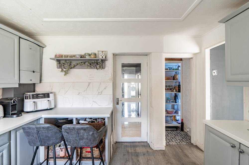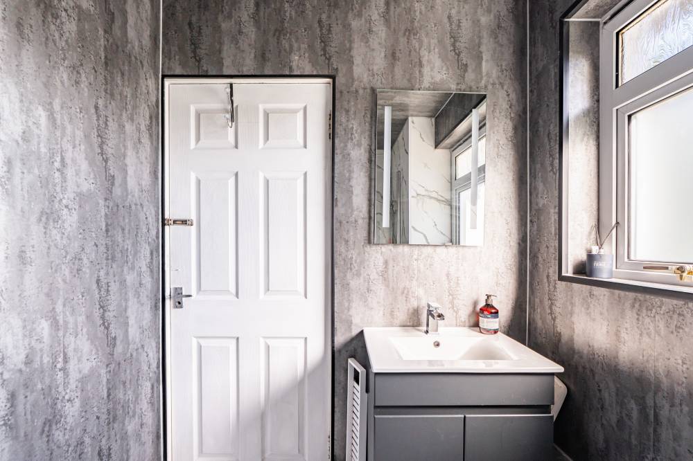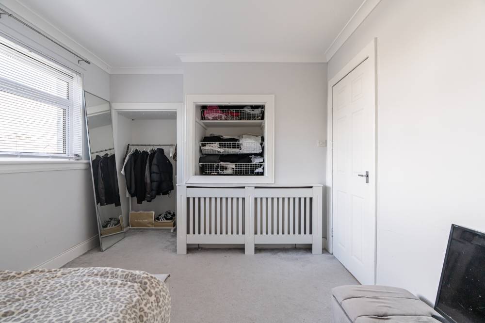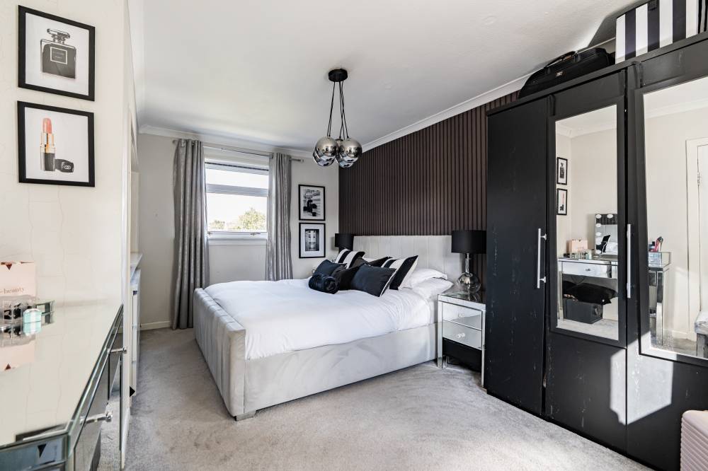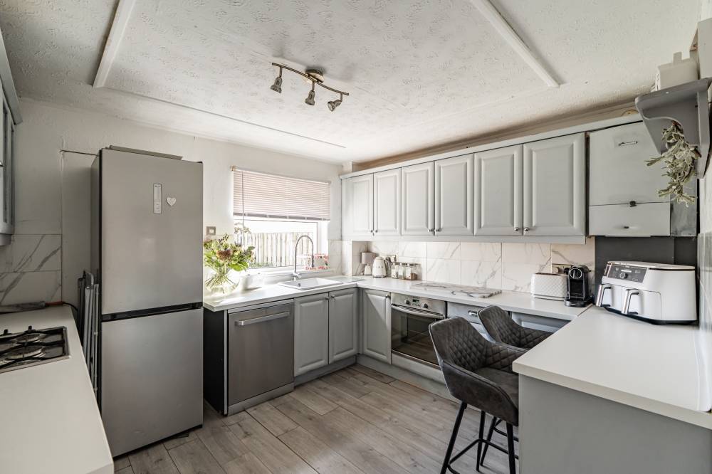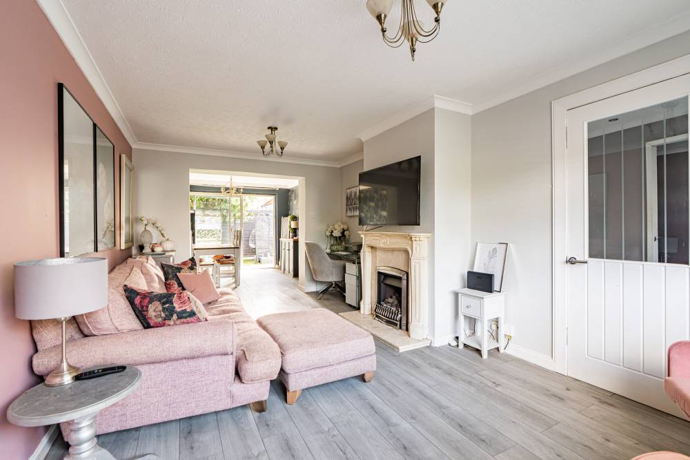 The welcoming entrance hallway sets the tone with tiled flooring, a useful cloak cupboard, understairs storage, and a handy utility corner with space for freestanding appliances. The bright and generously proportioned lounge/diner features a dual aspect outlook, gas fireplace, and sliding glass doors leading directly to the rear garden – creating an ideal space for both everyday living and entertaining. The fitted kitchen provides a range of integrated and freestanding appliances, splash tiling for easy upkeep, grey units with contrasting white worktops, and the added benefit of an open pantry cupboard. A good-sized double bedroom on the ground floor offers flexibility for use as a guest room, home office, or playroom. Upstairs, the landing gives access to the attic via a Ramsay ladder. The principal bedroom is a large double with a dual aspect, a fitted dressing table, and ample space for freestanding furniture. A further double bedroom provides an overstairs cupboard and open wardrobe space. The stylish bathroom is finished with full panelled walls, a rainfall shower over bath, heated towel rail, vanity unit, and illuminated mirror.