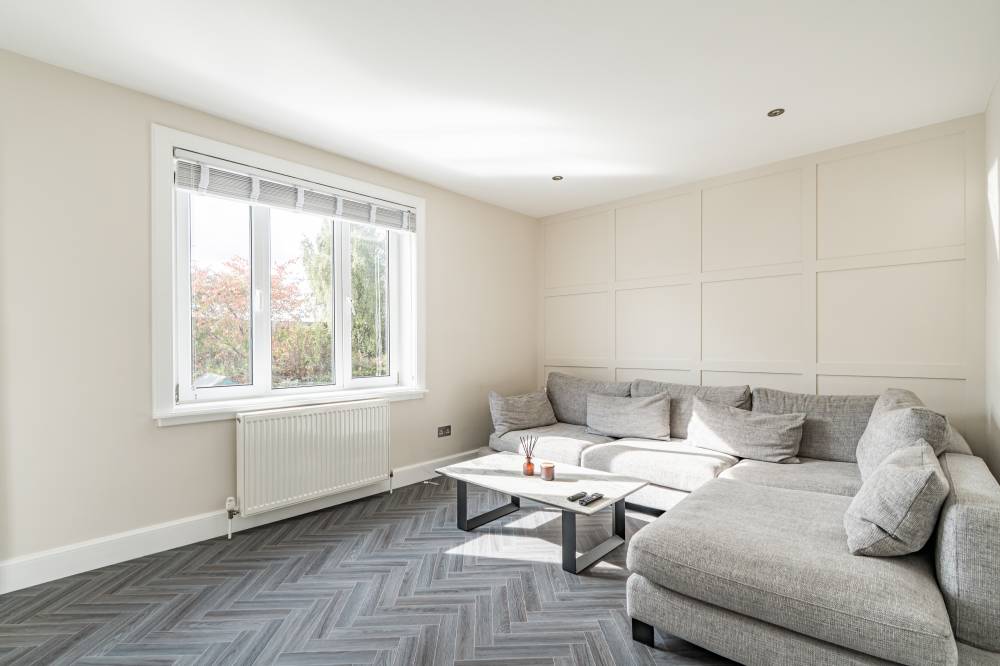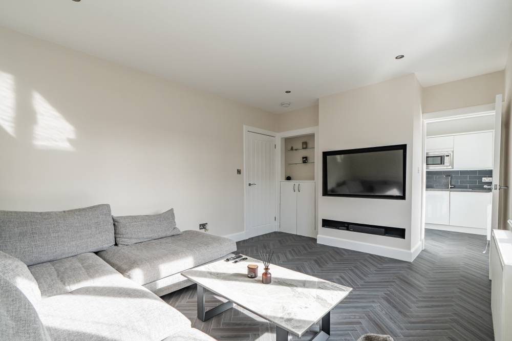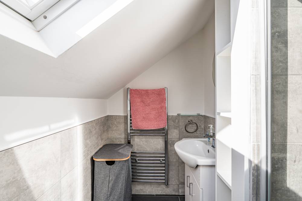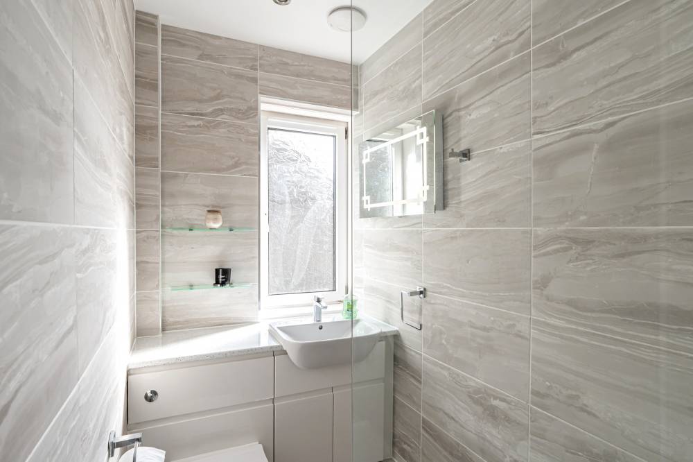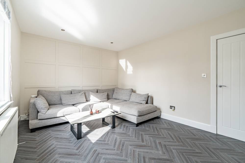 Upon entering through the main door, a private internal staircase leads to a welcoming hallway, setting the tone for the stylish interior beyond. The bright and generously proportioned reception room is positioned to the rear of the property and boasts a contemporary media wall, panel detailing, and an elegant finish, an ideal space for both entertaining and relaxing. The kitchen overlooks the garden and has been fitted to a high standard, featuring sleek white high-gloss wall and base units, quality integrated appliances, and a modern tiled splashback. This well-designed space combines both practicality and style. There are two spacious double bedrooms on this level. One is set to the rear with modern décor, fitted storage, and a comfortable carpet finish, while the other lies to the front of the property and also benefits from generous proportions and a calm, neutral palette. Completing the accommodation on this floor is a beautifully appointed shower room, finished with full tiling, built-in vanity storage, a cubicle housing a dual-headed thermostatic shower, and contemporary sanitary ware. The upper level hosts a third double bedroom, which benefits from clever built-in storage solutions and its own private en-suite shower room, an excellent option for visiting guests, teenagers, or as a luxurious principal suite.