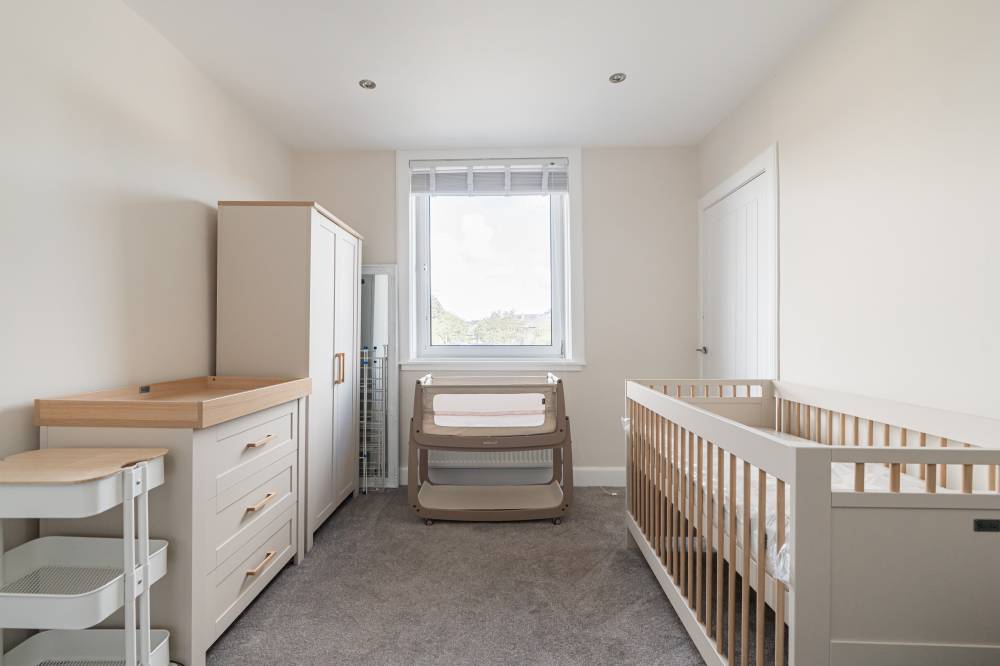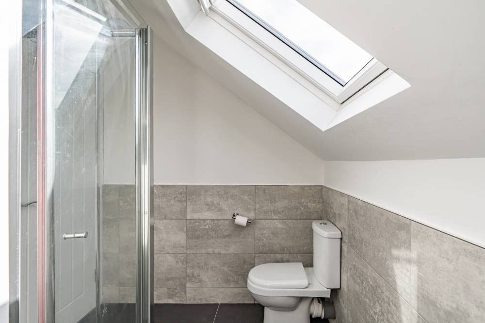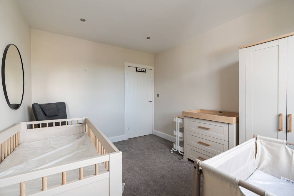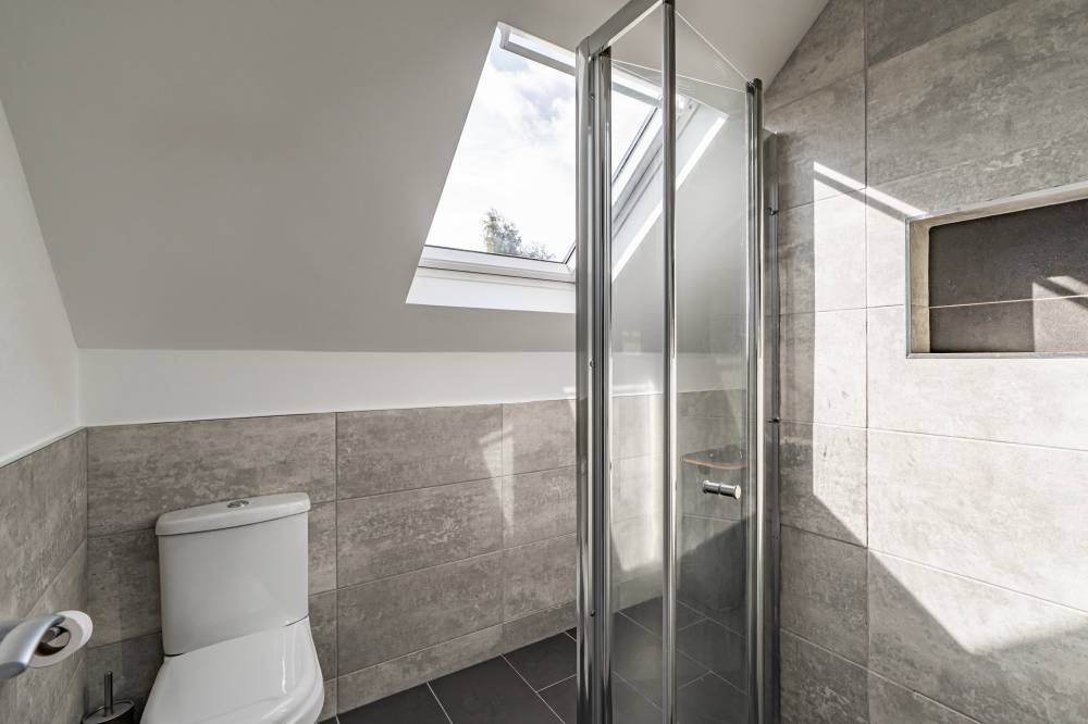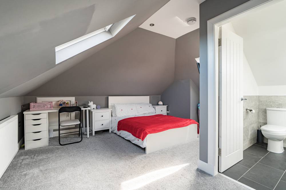 Upon entering through the main door, a private internal staircase leads to a welcoming hallway, setting the tone for the stylish interior beyond. The bright and generously proportioned reception room is positioned to the rear of the property and boasts a contemporary media wall, panel detailing, and an elegant finish, an ideal space for both entertaining and relaxing. The kitchen overlooks the garden and has been fitted to a high standard, featuring sleek white high-gloss wall and base units, quality integrated appliances, and a modern tiled splashback. This well-designed space combines both practicality and style. There are two spacious double bedrooms on this level. One is set to the rear with modern décor, fitted storage, and a comfortable carpet finish, while the other lies to the front of the property and also benefits from generous proportions and a calm, neutral palette. Completing the accommodation on this floor is a beautifully appointed shower room, finished with full tiling, built-in vanity storage, a cubicle housing a dual-headed thermostatic shower, and contemporary sanitary ware. The upper level hosts a third double bedroom, which benefits from clever built-in storage solutions and its own private en-suite shower room, an excellent option for visiting guests, teenagers, or as a luxurious principal suite.