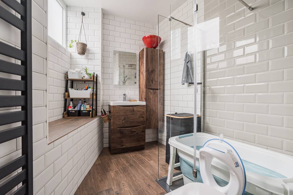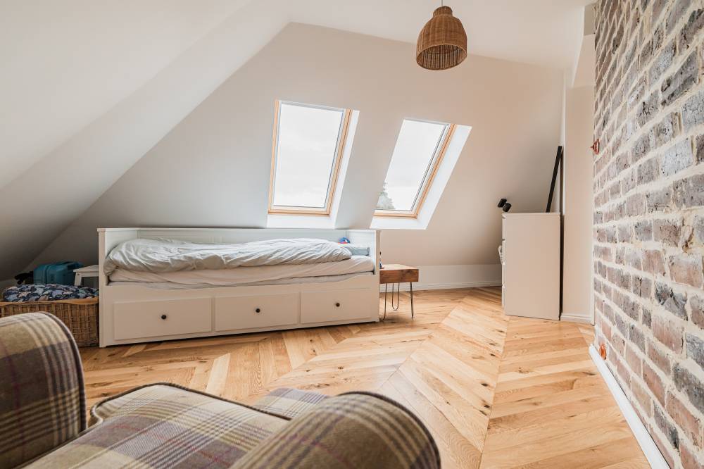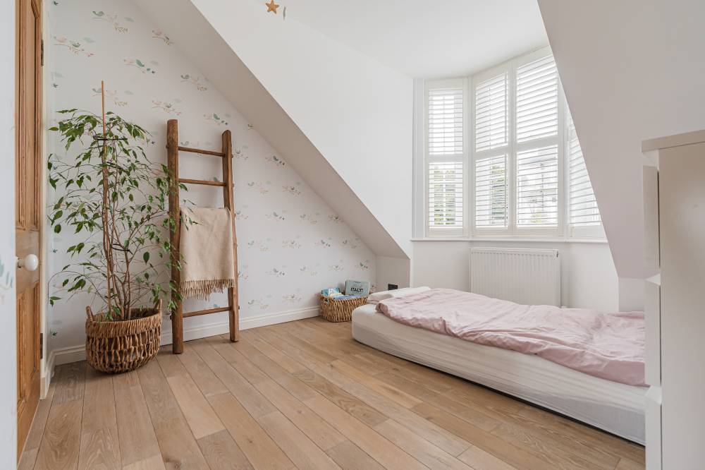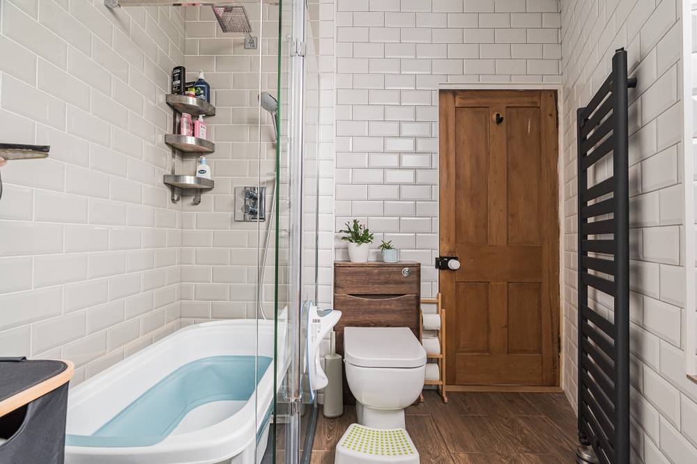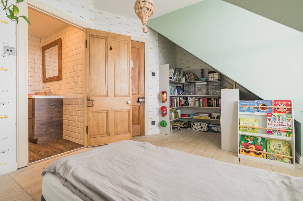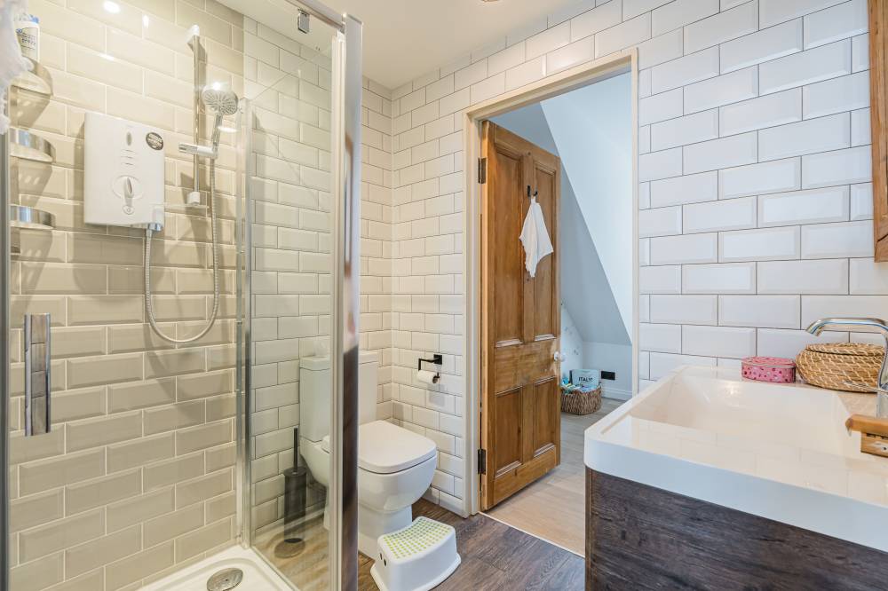 The property boasts a number of beautifully presented bedrooms. One double bedroom lies to the front of the property and benefits from a fitted wardrobe, while another features wooden flooring, exposed brickwork for a characterful touch, and two triple-glazed Velux windows which create a bright and airy feel. A further two double bedrooms, both enhanced by attractive bay windows which add light and character. These two rooms are linked by a Jack and Jill en-suite shower room, which has been modernised in a contemporary style, ideal for family living or visiting guests. The accommodation is further enhanced by a luxurious main shower room, fully tiled and fitted with a two-piece vanity unit, glass cubicle with a dual-headed thermostatic shower, and the comfort of electric underfloor heating.