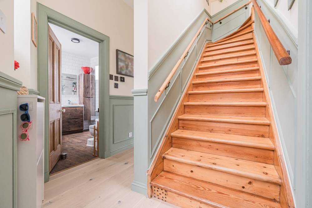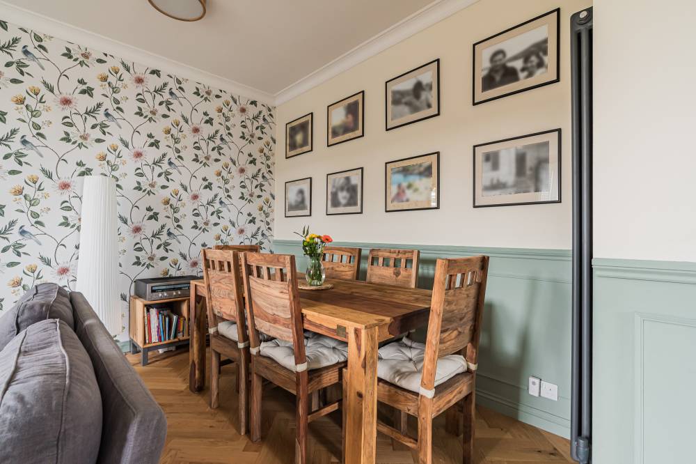A welcoming hallway leads into the striking open-plan living space, which forms the heart of the home. Flooded with natural light from three large windows, this versatile room offers ample space for both reception and dining purposes. A modern fitted kitchen has been carefully designed with a range of sleek units and integrated appliances, complemented by engineered wood flooring with under floor heating, for a seamless flow. A log burner provides a cosy focal point, while access is available to the basement level.