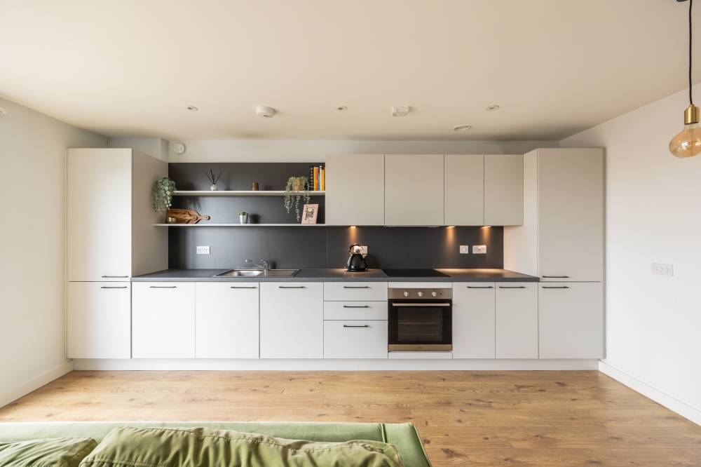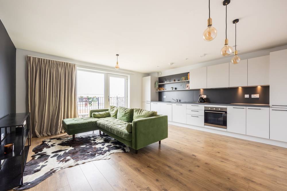 The apartment is accessed via a secure entry system, with both lift and stair access to all floors. A welcoming entrance hallway with useful built-in storage sets the tone, leading into the bright and spacious reception/dining room. This stylish living area is flooded with natural light and enjoys direct access to a private balcony, creating the ideal setting for both relaxation and entertaining. The open-plan modern kitchen has been thoughtfully designed, featuring a peninsula layout and a range of sleek units with integrated appliances. The design maximises both workspace and storage, offering a practical yet stylish hub at the heart of the home. The generously sized double bedroom provides a peaceful retreat, complete with fitted wardrobes to ensure excellent storage solutions. A contemporary bathroom completes the accommodation, finished with a crisp white three-piece suite, shower over bath, and attractive tiling.