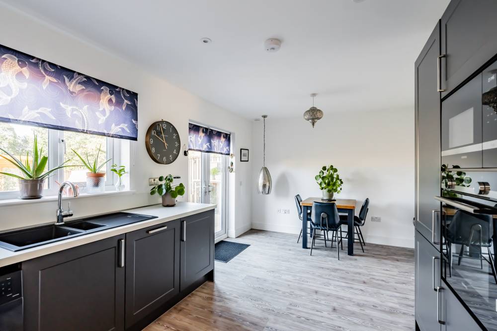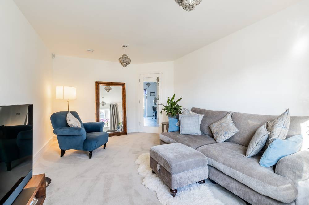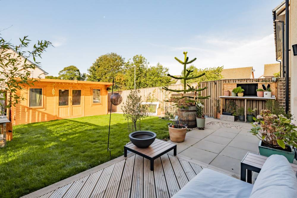The front garden is neatly landscaped with a pathway leading to the entrance, complemented by areas of lawn that enhance the property’s kerb appeal. To the rear, the fully enclosed south facing garden provides a safe and private retreat, with a generous expanse of lawn, and a patio and decking area offering space for outdoor dining.