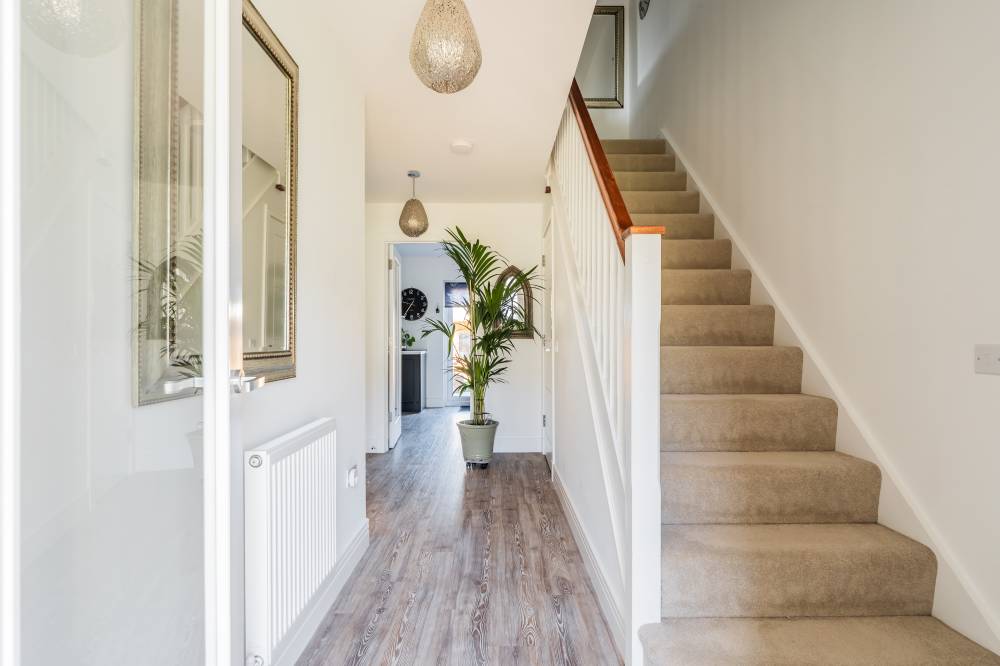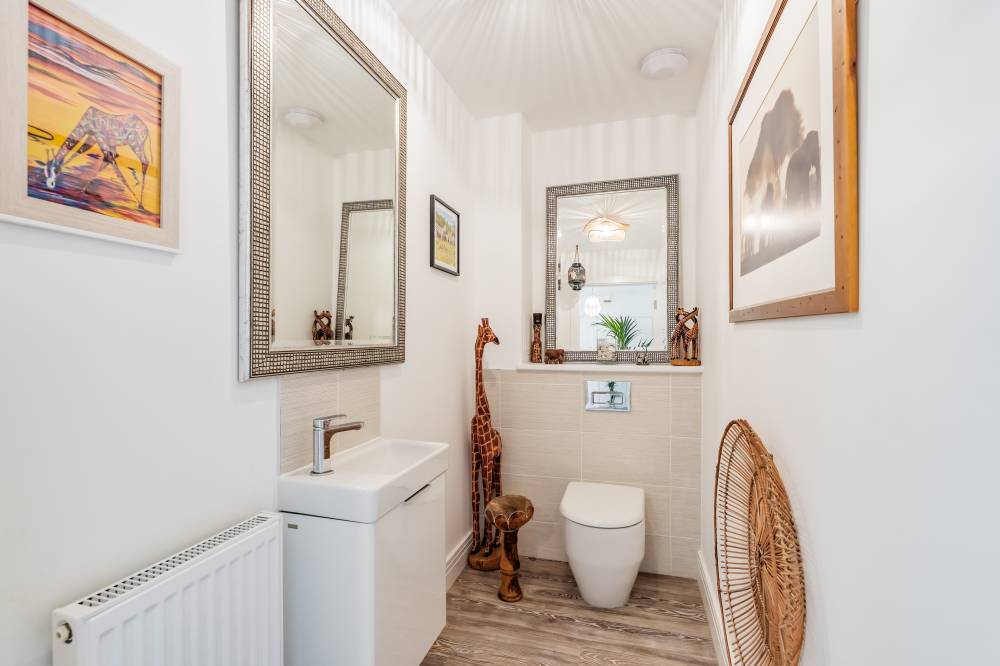 Presented in pristine move in condition, the front door opens into an entrance vestibule and welcoming hallway equipped with understairs storage. From here you move into a bright and spacious front-facing reception room, ideal for relaxing and entertaining. To the rear, the stylish dining kitchen showcases high-quality wall and base units and integrated appliances, with French doors opening directly to the south-facing garden for seamless indoor-outdoor living. A useful guest WC completes the ground floor.