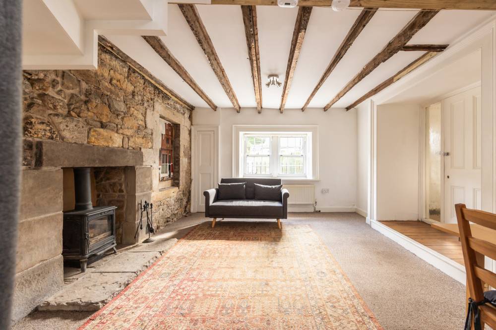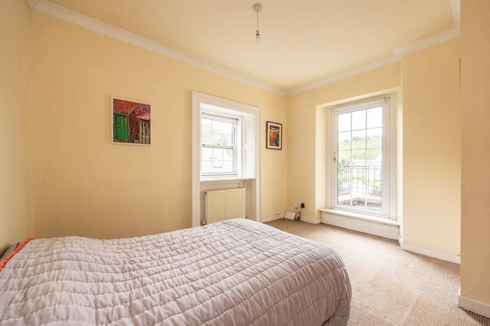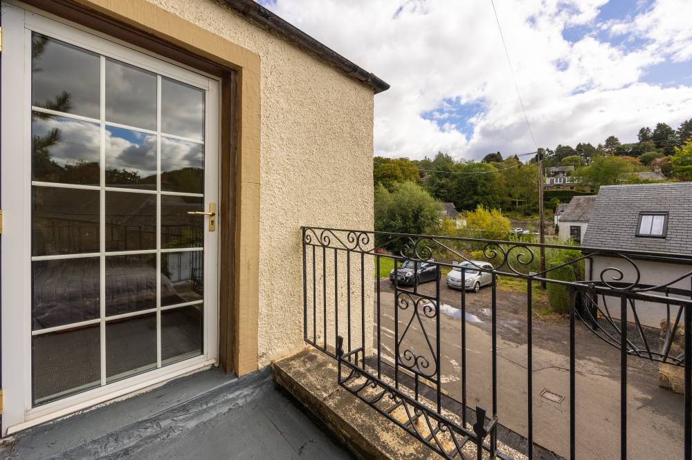 A welcoming entrance vestibule with built-in storage leads to an impressive and appealing reception room with beamed ceiling, exposed stone wall and a cosy multi-fuel stove, with ample room for both living and dining furniture. A door leads to the kitchen to the rear which is fitted with a good range of wall and base units with integrated oven, hob and cooker hood with the washing machine and fridge freezer also included. A back door leads to the drying green and in turn the garden. The bathroom is located on the ground floor and has a white four piece suite including separate walk in shower. Stairs from the reception room lead to the upper landing. The principal bedroom to the front benefits from a private balcony, there is a second double bedroom to the rear with built-in storage space and a third bedroom, ideal as a home office or study with Velux window to the side. An additional WC with two piece white suite is also located on the first floor. Benefits include gas central heating and full double glazing.