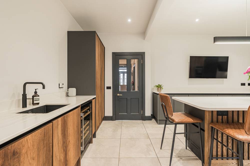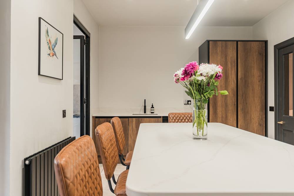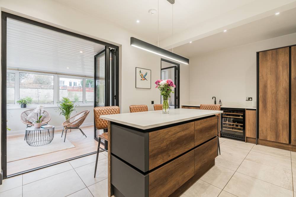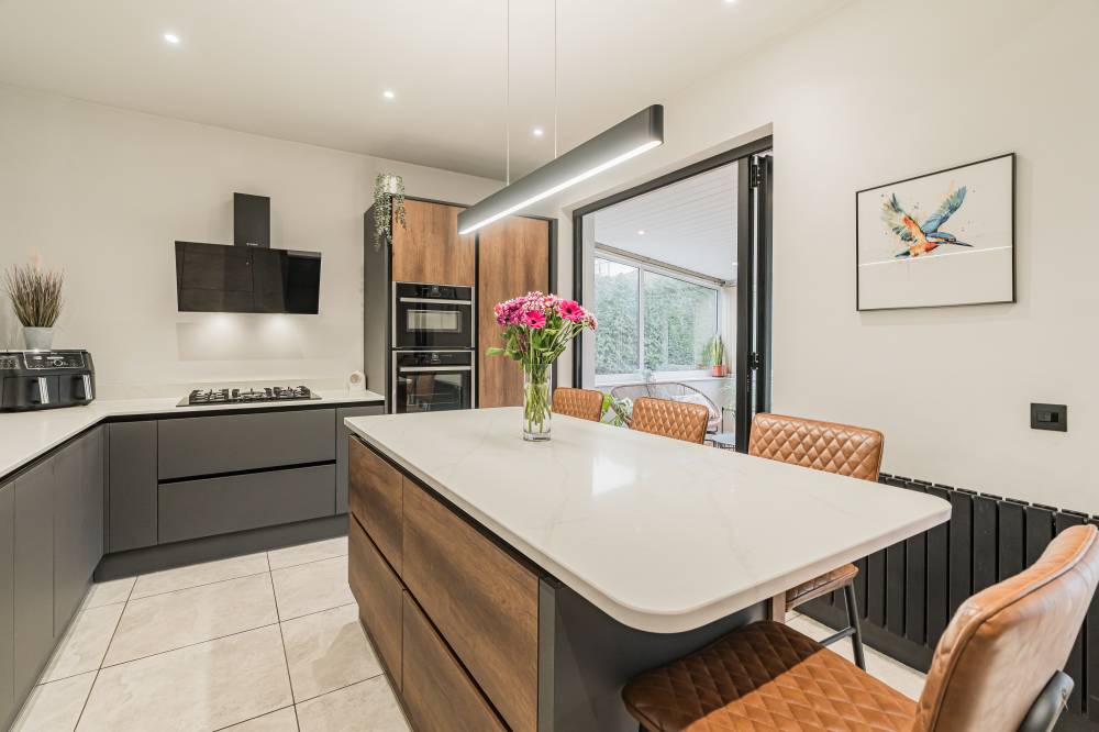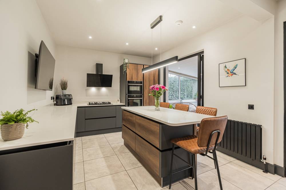The accommodation begins with a welcoming entrance vestibule, from here, you step into a central hallway which includes a particularly generous storage area, ideal for coats, shoes and household items. To the front of the home lies a bright and spacious bay-windowed reception room, filled with natural light and offering a comfortable and inviting space for both relaxing and entertaining. The attractive multi-fuel burner forms a charming focal point, adding warmth and character while creating a cosy atmosphere during the colder months. The proportions of this room easily accommodate a variety of furniture layouts, making it equally suited to quiet evenings or hosting guests. The heart of the home is undoubtedly the beautifully opened-up contemporary kitchen, thoughtfully redesigned to create a stylish yet highly functional space for modern living. Finished with sleek units and quality worktops, the kitchen is fitted with an excellent range of appliances including hob, oven, integrated microwave/grill, integrated fridge and integrated dishwasher, along with a washing machine and tumble dryer, all of which are included in the sale. The layout has been carefully considered to maximise both workspace and storage, making cooking and entertaining a pleasure. Just off the kitchen is a practical utility room, ideal for additional storage and laundry needs, with convenient access directly to the rear garden. A bright conservatory is also accessed from the kitchen, offering a lovely additional living space that can be used as a dining area, reading room or peaceful spot to enjoy views of the garden throughout the seasons. The property offers two generous double bedrooms, both well proportioned and benefitting from fitted wardrobes that provide excellent storage without compromising on space. Completing the internal accommodation is a modern shower room finished to a high standard, with contemporary fittings and tasteful décor that enhances the overall quality of the home.