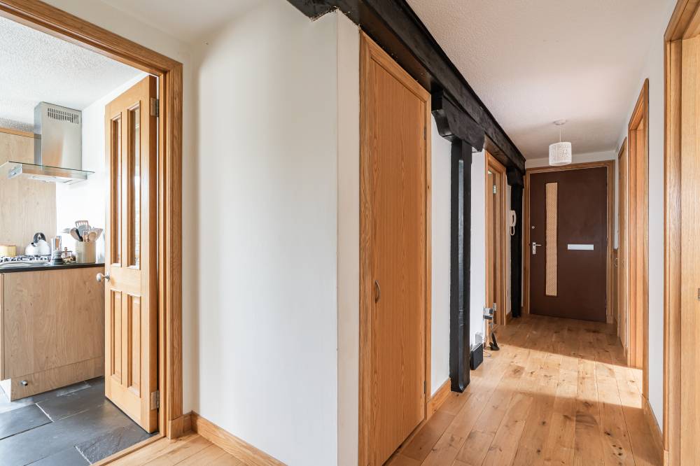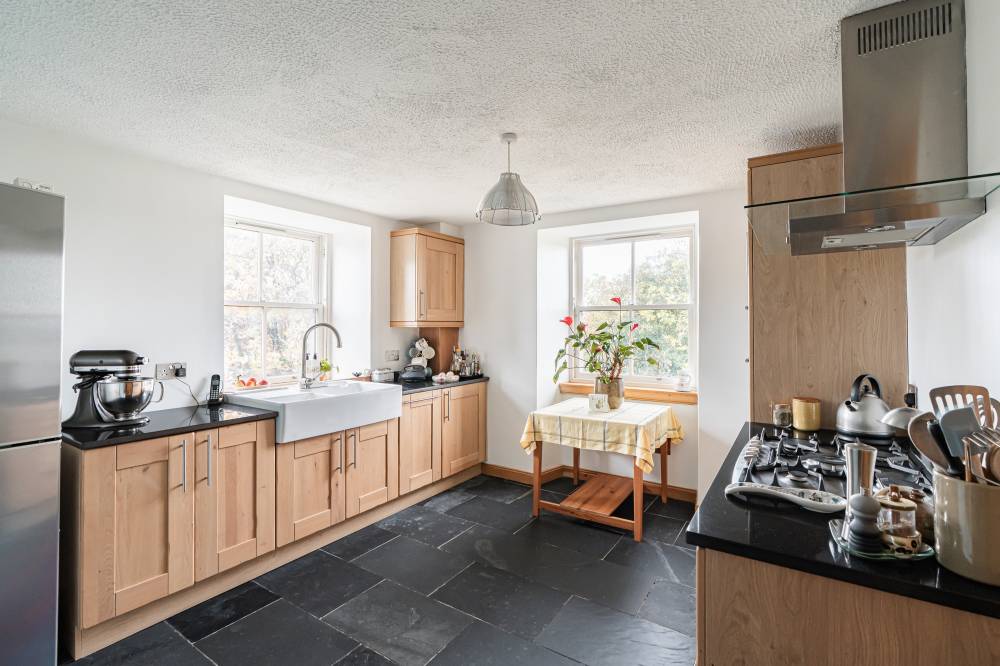 In move in condition, you enter a welcoming hallway with feature pine beams and two storage cupboards, and this leads you to the bright and airy, dual aspect lounge. Across the hall is the country style dining kitchen which has a range of wall and base units with co-ordinated worktops, double Belfast sink, useful pantry/utility cupboard, and views to the Forth. The generous principal bedroom has a built in wardrobe and open views, and the second double bedroom also has a built in wardrobe. Completing the accommodation is the bathroom with a white suite, heated towel rail, feature beam, and overhead rainfall shower. The property also benefits from gas central heating and double glazing.