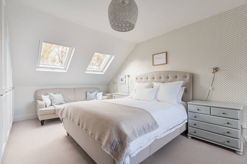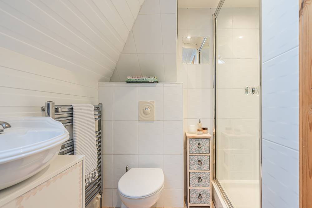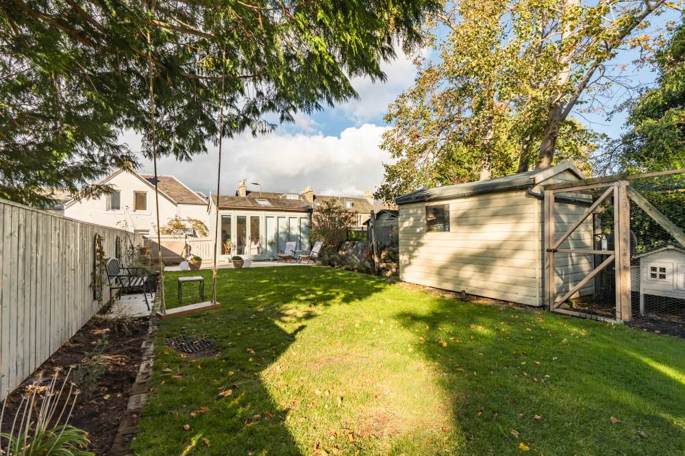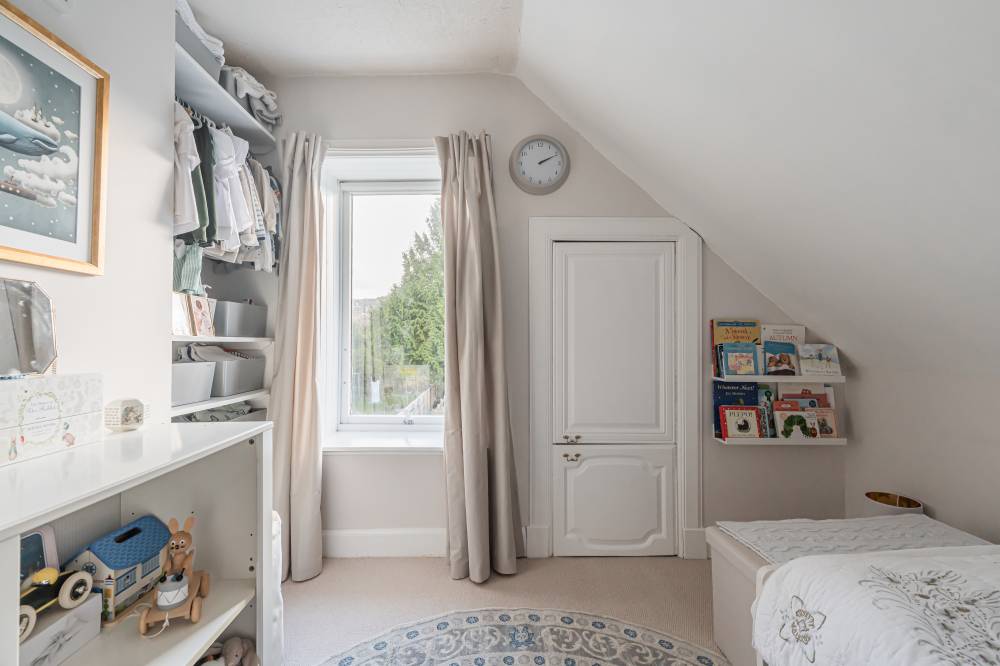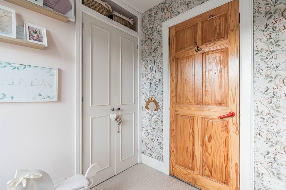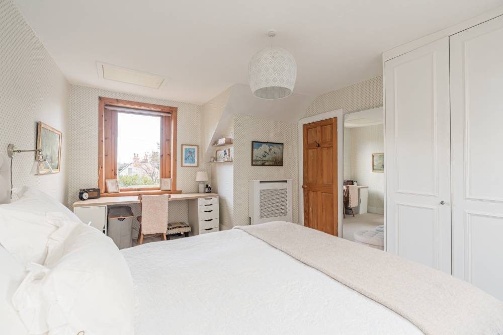 Upstairs, the main bedroom is a generous double with dual-aspect Velux windows, fitted wardrobes, and access to a small loft space. The second bedroom offers good proportions and space for freestanding furniture, while the third bedroom features a traditional Edinburgh press cupboard, making an ideal single or home office. The family bathroom includes a corner jacuzzi bath, separate shower cubicle, Velux window, partial tiling, and a heated towel rail.