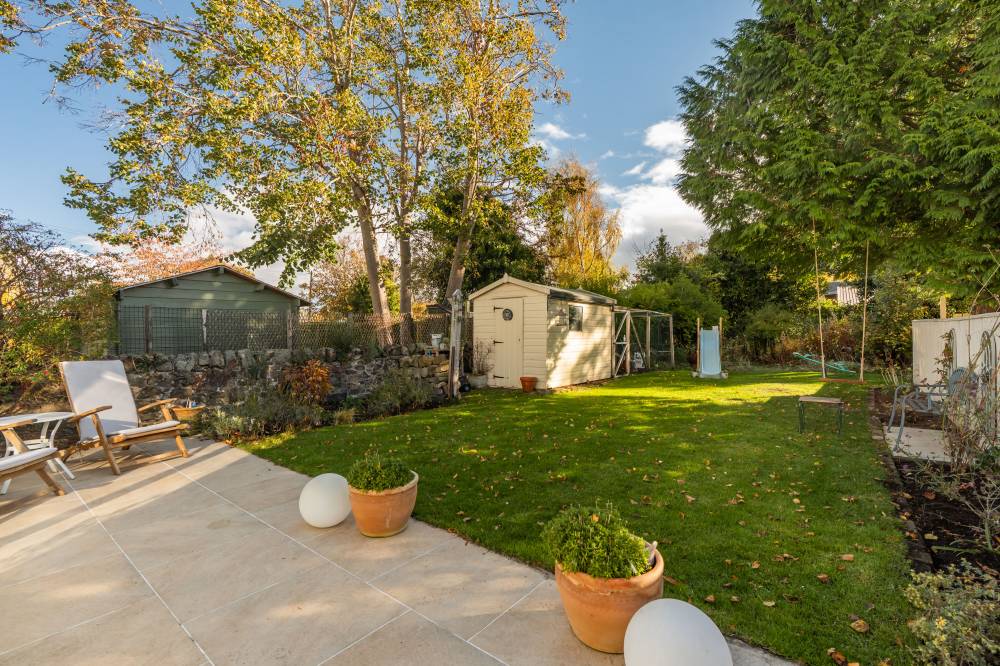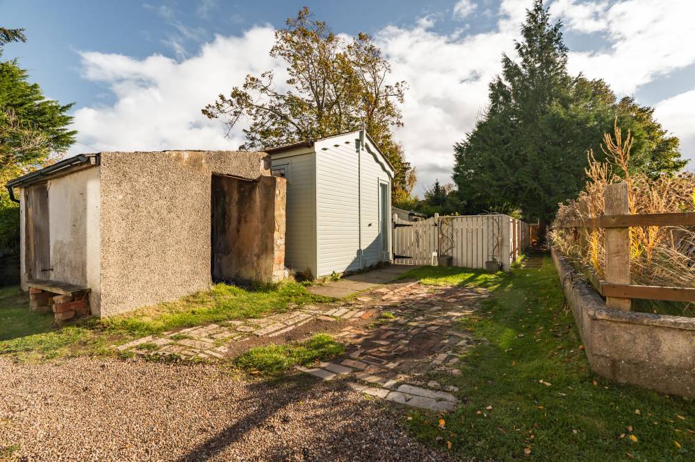 Externally, a driveway for one car sits at the end of the shared lane, leading to a beautifully maintained private garden. This delightful outdoor space features a patio area, a well-kept lawn, mature surrounds, and additional structures including a lovely, powered summer house offering flexible use, and shed.