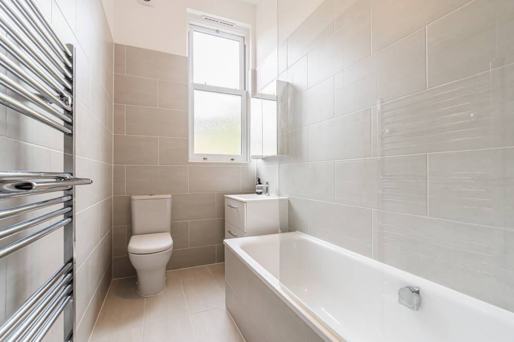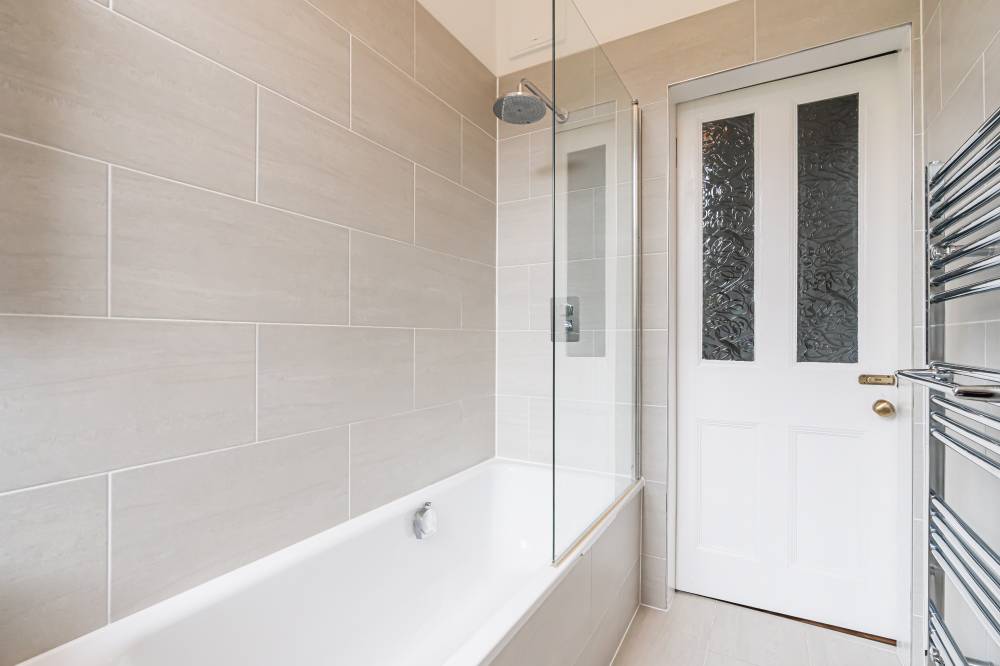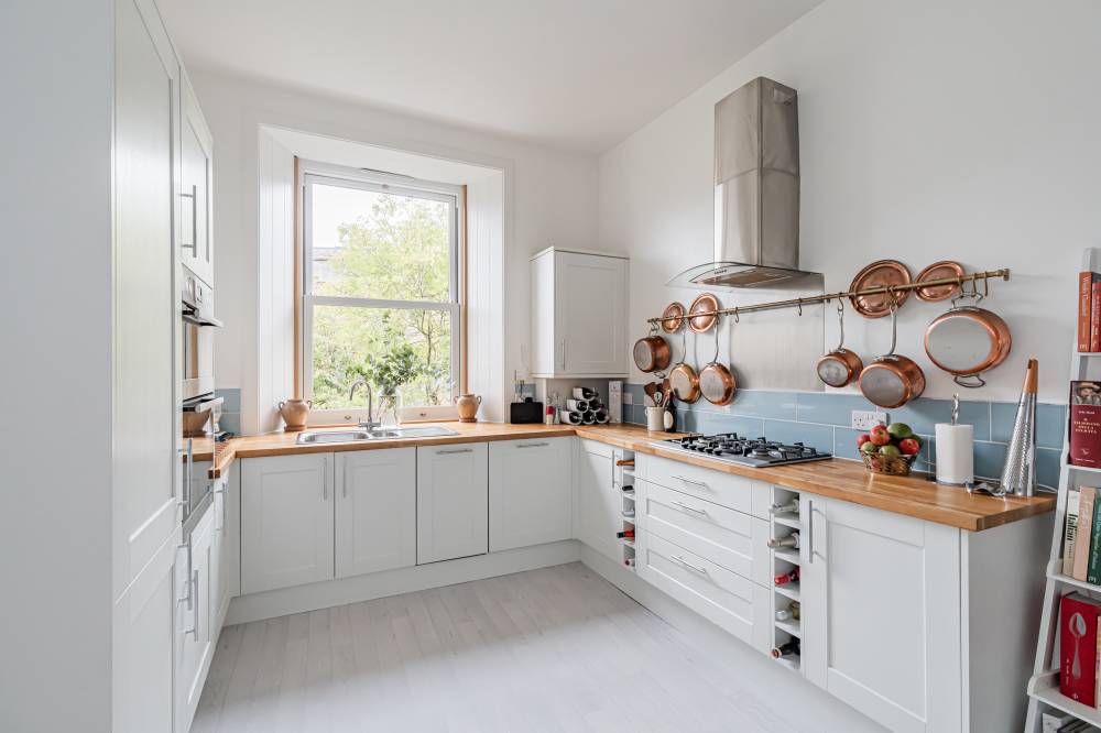 A welcoming hallway with a large storage cupboard and a shelved press leads into the elegant bay-fronted lounge. This impressive space boasts lovely open aspects and retains beautiful period features such as intricate cornicing, an Edinburgh press, and a traditional gas fireplace. The charming kitchen/diner offers an ideal setting for relaxed meals, featuring a range of integrated white goods, real wooden worktops, and under-unit lighting. A partially tiled finish provides easy upkeep, while a dining recess adds character and functionality. The rear-facing double bedroom is well-proportioned, providing room for freestanding furniture and benefitting from an under-window storage cupboard. A versatile box room currently serves as a nursery but could equally be used as a study or dressing room. Completing the home is a modern bathroom, fully tiled with a tiled floor, rainfall shower over bath, and heated towel rail.