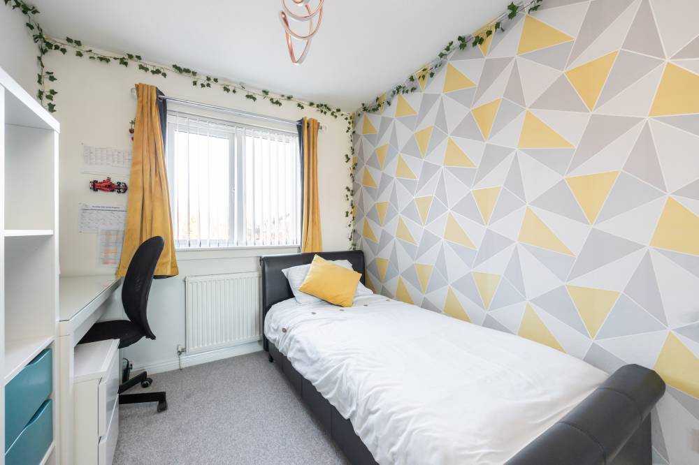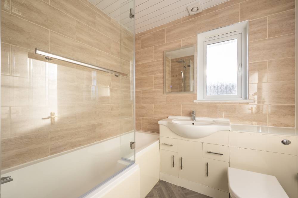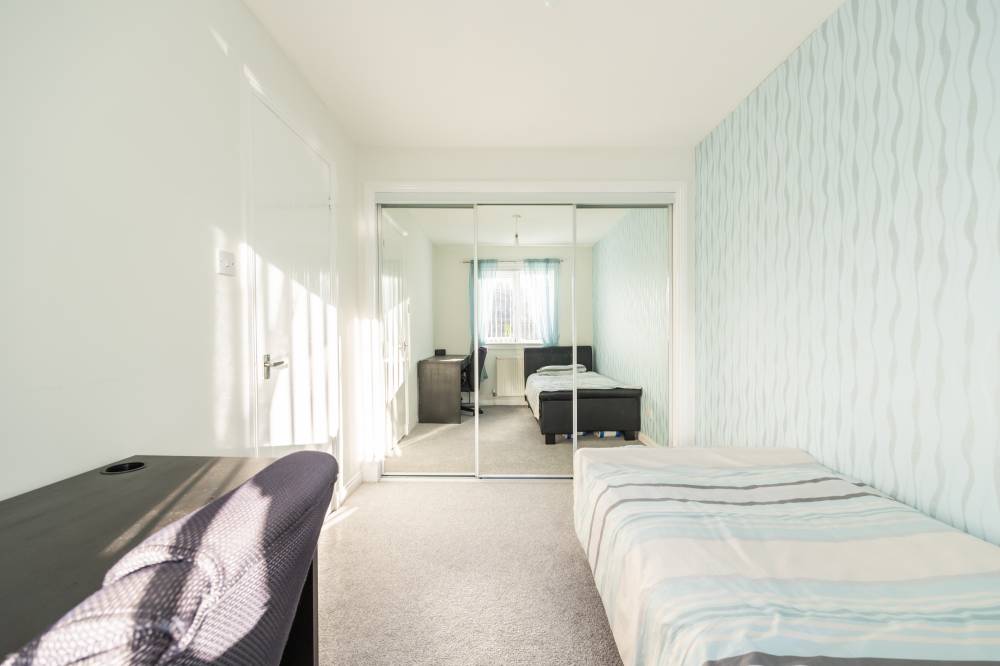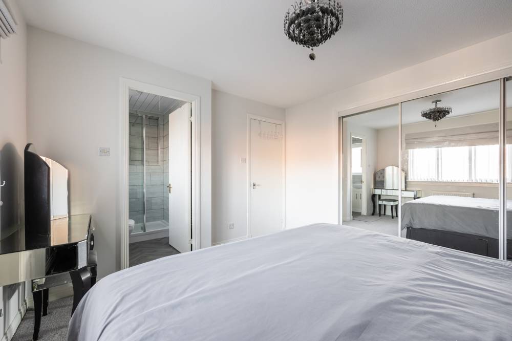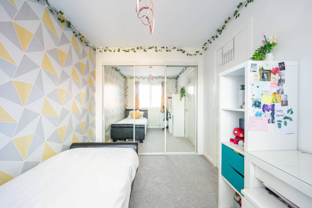 The upper landing provides access to a partially floored attic and an additional storage cupboard. The principal bedroom is a well-proportioned front-facing double featuring integrated sliding mirrored wardrobes and a stylish en-suite shower room with rainfall shower, step-in cubicle, partial tiling and heated towel rail. Bedrooms two and three are both generous rear-facing doubles with integrated wardrobes, while bedroom four is a large single room also benefitting from fitted storage and flexible usage options. The family bathroom is fitted with a shower over bath, rainfall shower fitting, partial tiling and heated towel rail.
