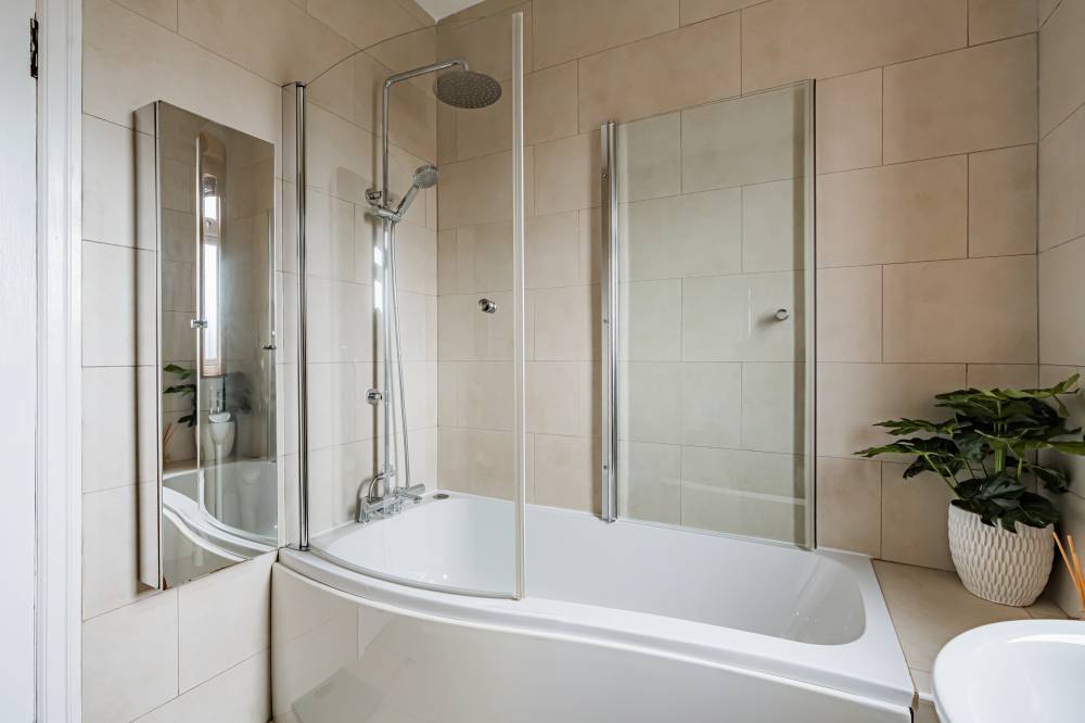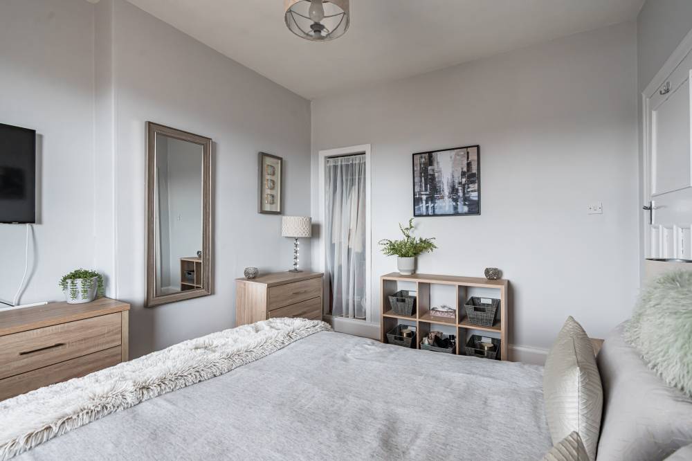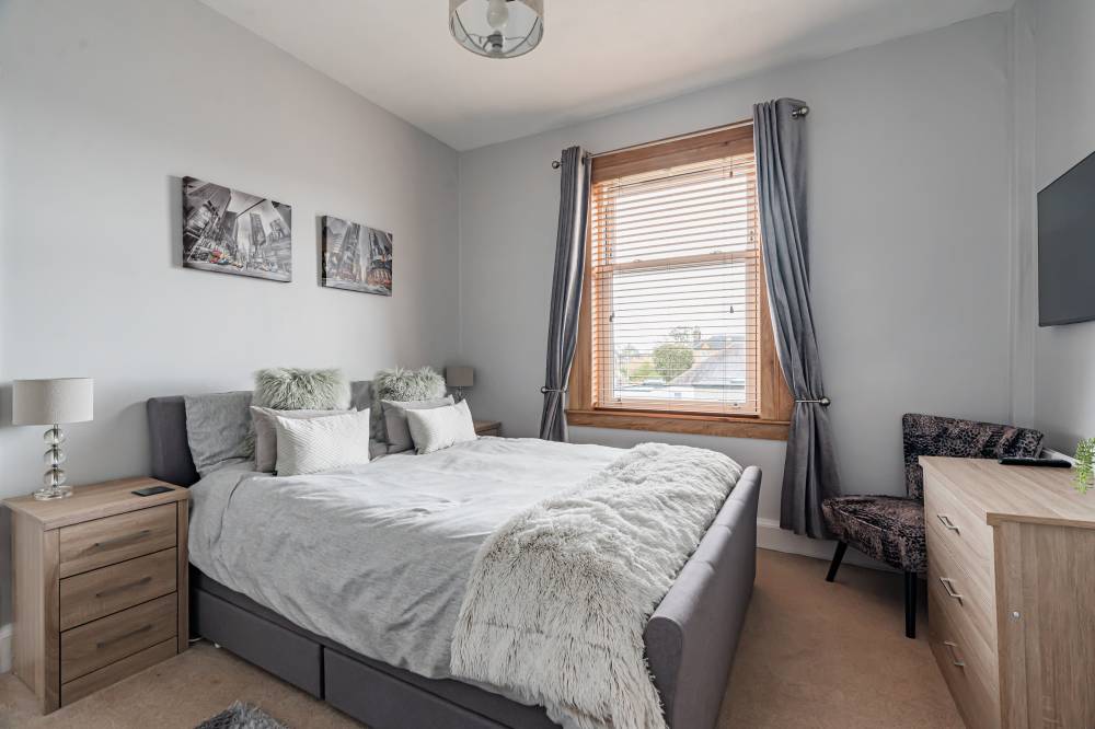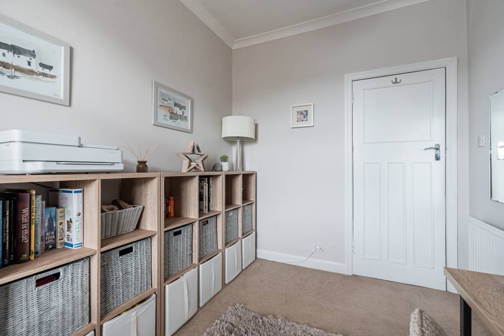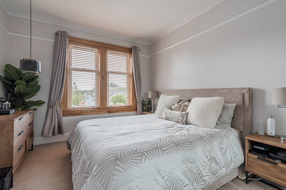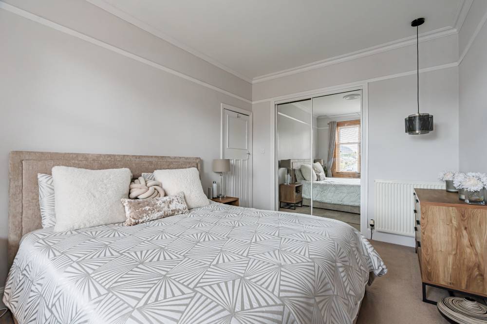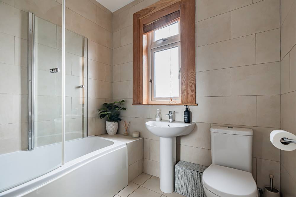 On the first floor, a shelved linen cupboard enhances storage. The second bedroom is a spacious double with integrated wardrobe, twin windows and further Arthur’s Seat views, while the third bedroom offers a rear outlook and an integrated single wardrobe. A fourth bedroom, also to the front, is a flexible single or ideal home office. The family bathroom is fully tiled with a rainfall shower-over-bath, heated towel rail, and tiled flooring.