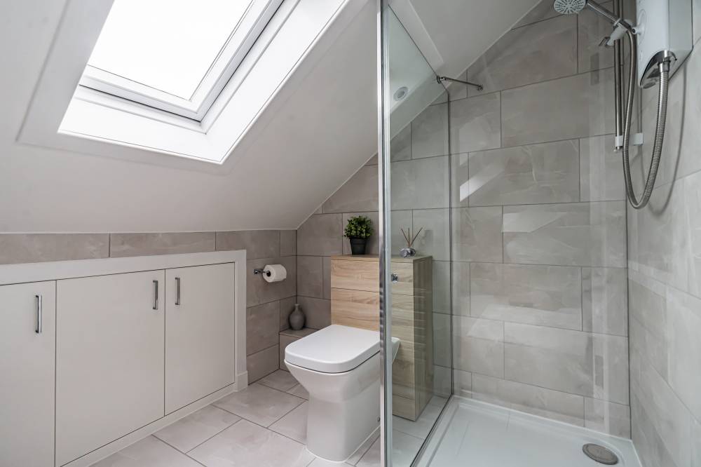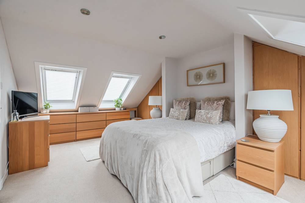 The upper landing enjoys natural light from a Velux window and useful storage space, leading to the master suite. This impressive principal bedroom is designed with twin Velux windows to the front and rear, wall-to-wall fitted wardrobes with custom joinery and eaves access for further storage. A stylish en-suite completes the retreat, featuring a walk-in shower, heated towel rail, Velux window and built-in storage.