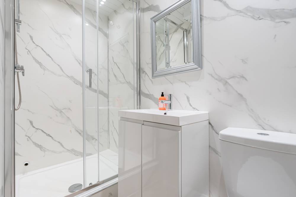 A welcoming hallway with a meter cupboard leads into a bright and open-plan lounge, kitchen, and dining area. This generous living space enjoys high ceilings and traditional proportions, enhanced by a press cupboard, under-window storage, and a tank cupboard offering additional space. The modern kitchen is fitted with a range of integrated and freestanding white goods, finished with partial tiling to the splash areas. The good-sized double bedroom enjoys a peaceful front aspect and offers ample room for various layouts and freestanding furniture. Completing the accommodation is a smart shower room with full paneling and a double cubicle.