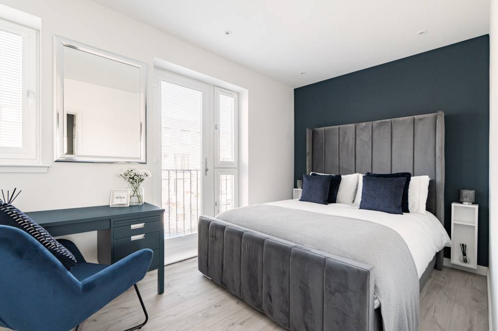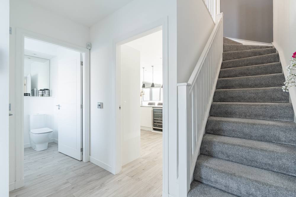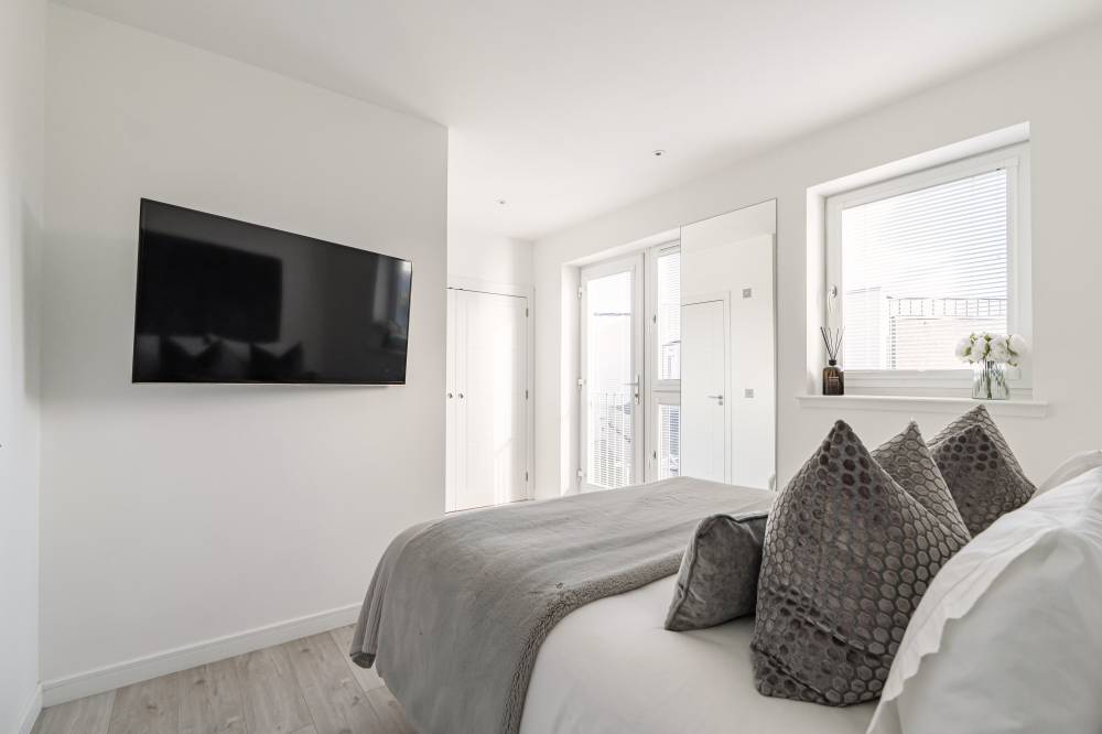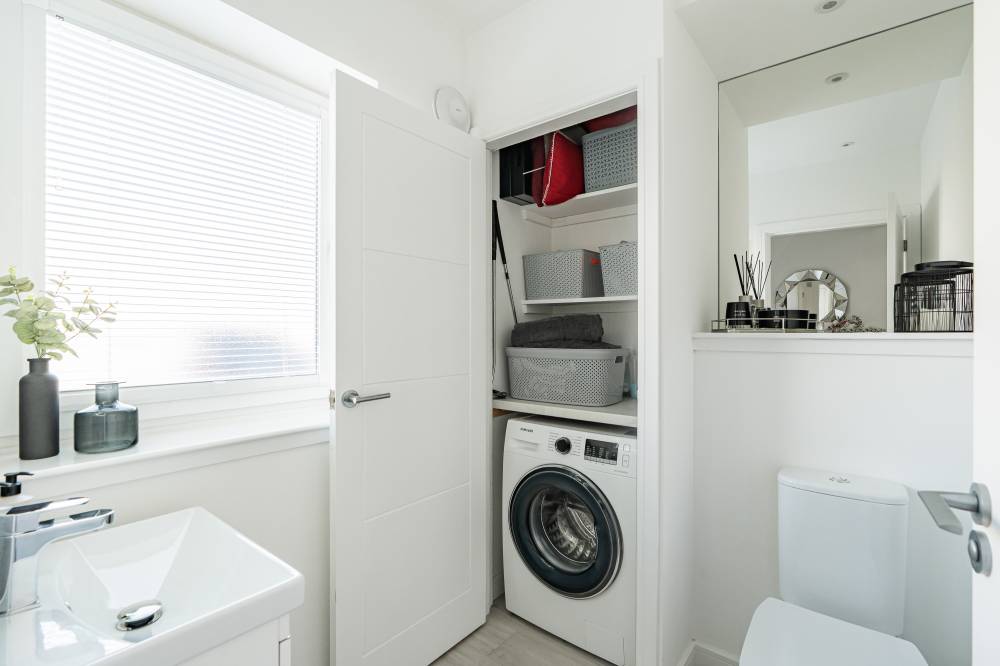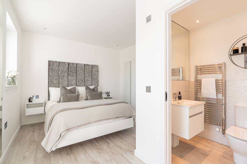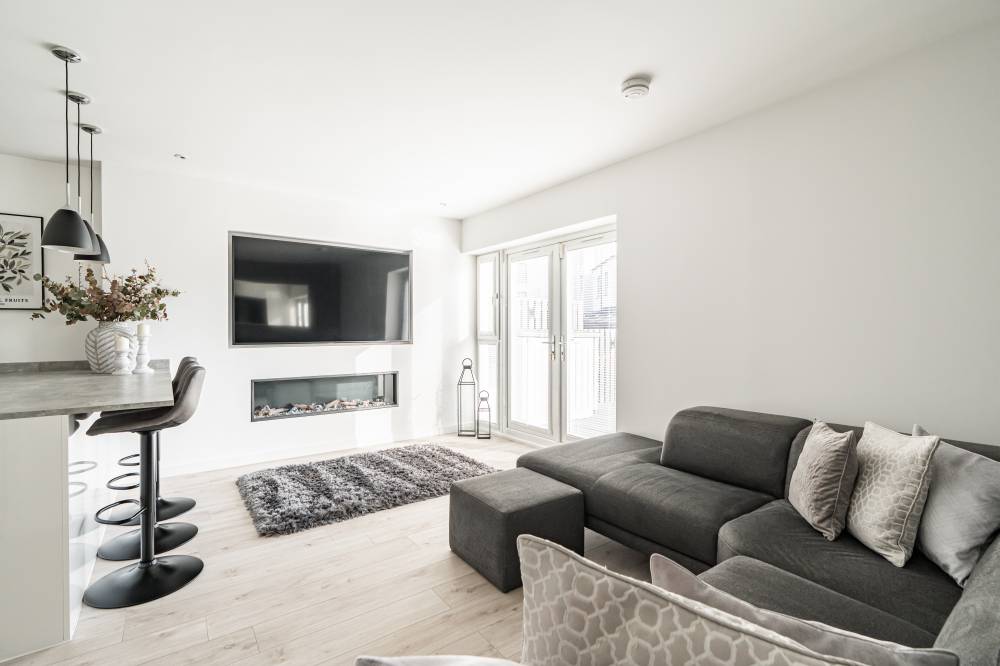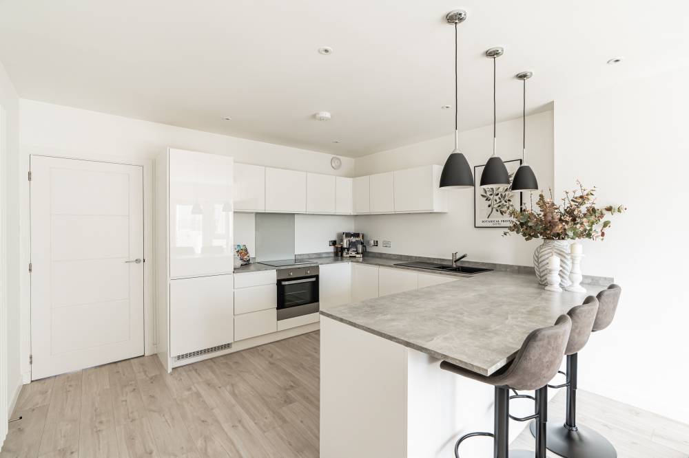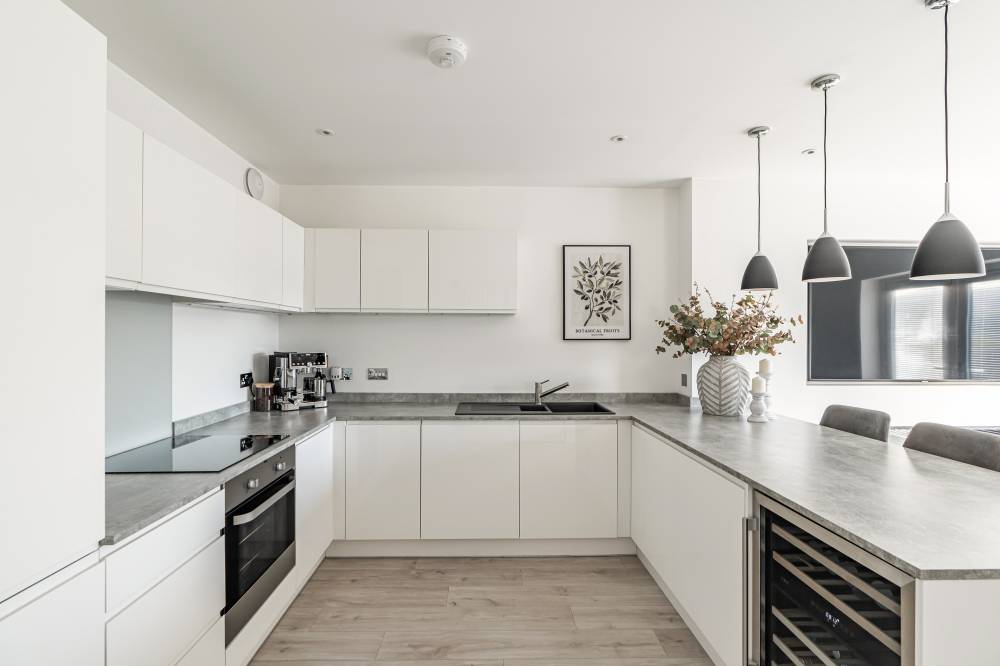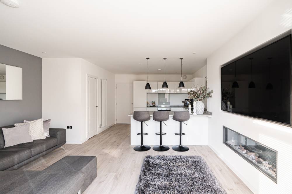 The accommodation in brief comprises; spacious welcoming hallway with downstairs WC and useful utility cupboard, generously proportioned and bright lounge/dining with media wall and French doors providing direct access to the rear garden, open plan to stunning fully fitted kitchen with breakfast bar, light and airy principal bedroom with fitted wardrobes and contemporary en-suite shower room, second well proportioned double bedroom with fitted wardrobes and modern bathroom with white three-piece suite. Further benefits include a district heating system and double glazing.