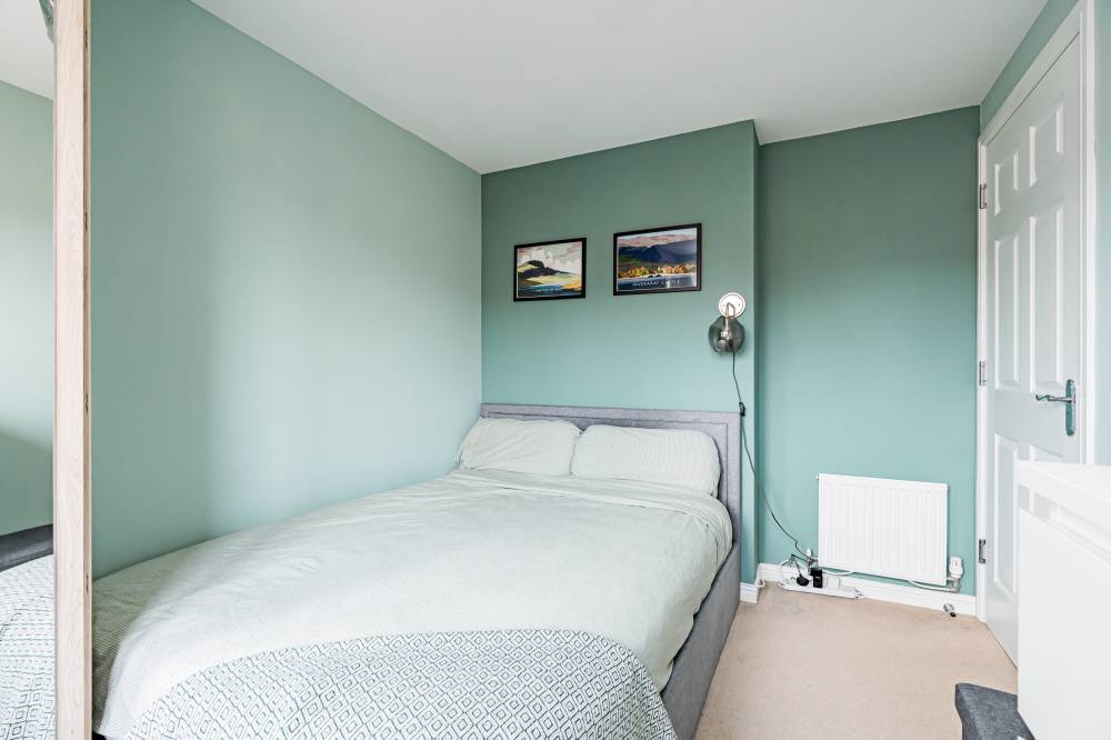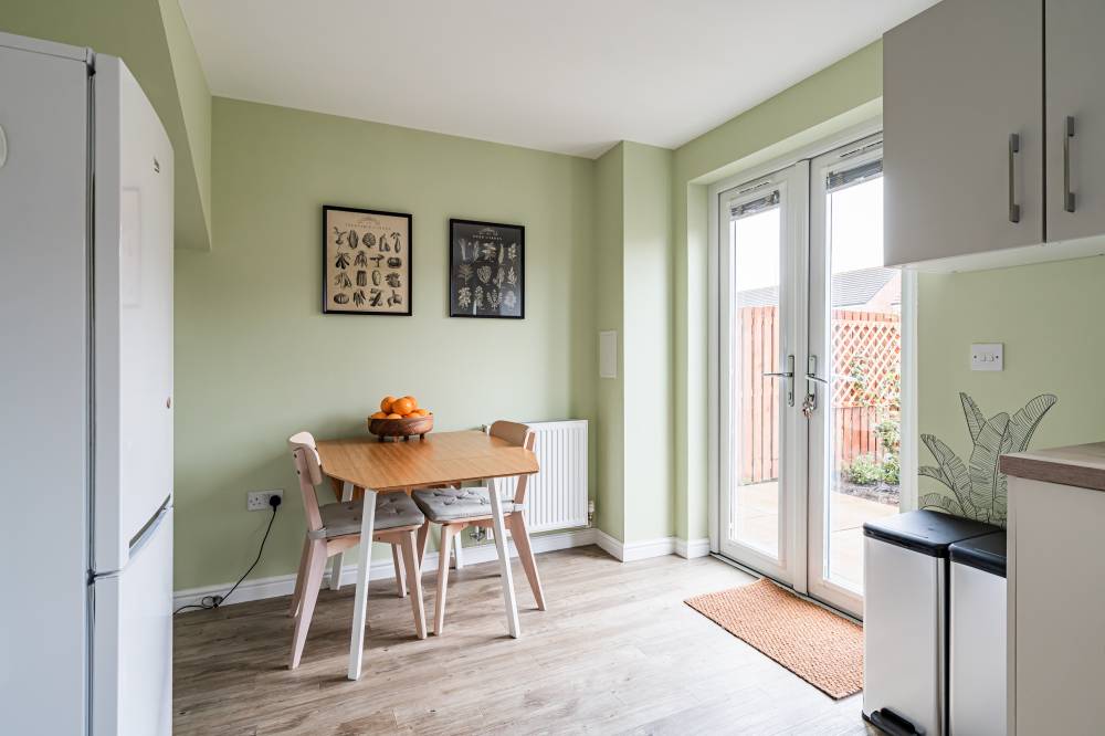 The ground floor features a welcoming entrance hallway with a convenient WC, leading through to a bright and generously proportioned living room. This comfortable reception space provides ample room for both relaxation and family gatherings, with neutral décor and modern finishes creating a calm and inviting atmosphere. To the rear, the stylish kitchen and dining room is well appointed with modern cabinetry, integrated appliances, and ample workspace. French doors open directly onto the private rear garden, making this an ideal setting for family meals and entertaining. On the first floor, the accommodation comprises three well-proportioned bedrooms, all offering flexibility for use as sleeping accommodation, a home office, or playroom. The family bathroom is finished to a high standard, featuring a contemporary white three-piece suite with shower-over-bath and attractive tiling. Occupying the top floor, the impressive principal bedroom provides a peaceful retreat, complete with generous proportions, fitted storage, and a private en-suite shower room.