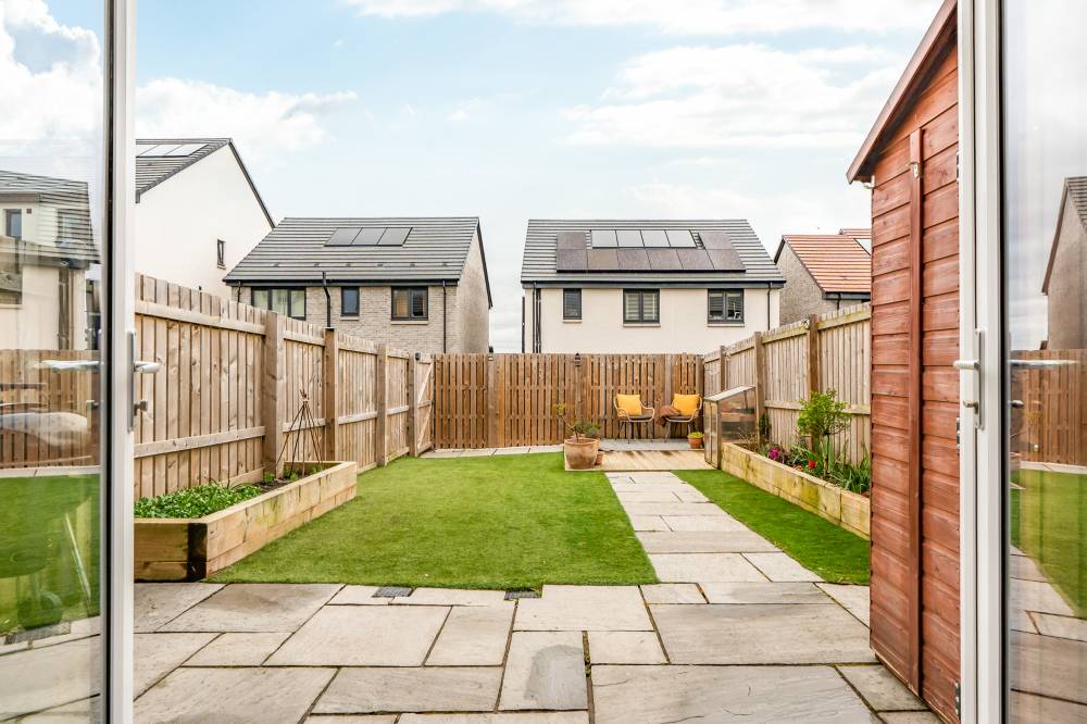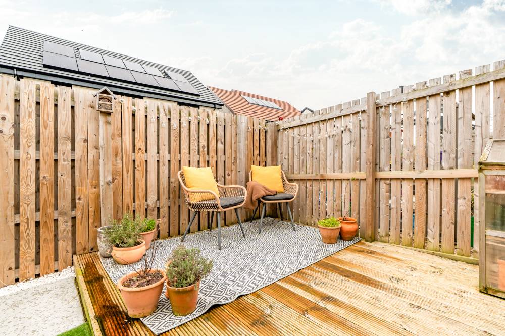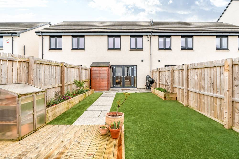 Externally, the property enjoys a neatly landscaped rear garden designed for easy maintenance and year-round enjoyment. The garden features a patio area, a deck for outdoor dining, raised flower and vegetable beds, and a section of artificial turf, offering a private, sunlit retreat. To the front, there is a private driveway providing off-street parking for one car.