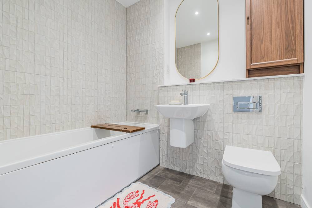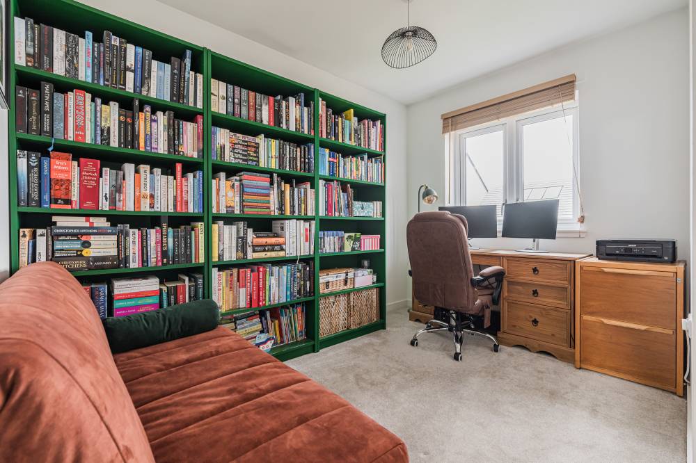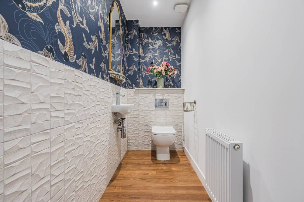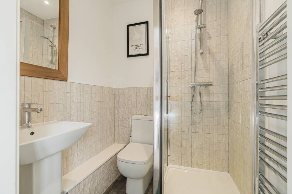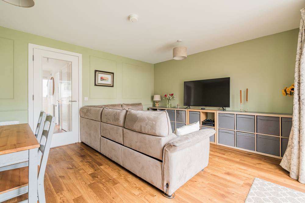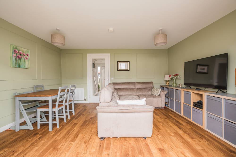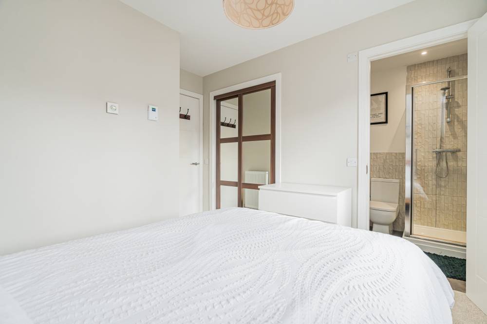 The property opens with a bright and inviting hallway, featuring a useful storage cupboard and a separate utility cupboard, perfect for keeping everyday essentials neatly tucked away. To the rear, the stylish reception room provides an elegant yet comfortable setting for both relaxation and entertaining. Glazed doors flood the space with natural light and open directly onto the enclosed rear garden, creating a wonderful flow between indoors and outdoors. The room also accommodates a generous dining area, enhanced by striking feature panel walls that add depth and character to the space. The beautifully appointed kitchen sits to the front of the home and features dark-toned wall and base units paired with sleek work surfaces. A full range of integrated appliances provides both style and convenience, ensuring a streamlined and functional cooking environment. Upstairs, the principal bedroom is a spacious double decorated in soft modern tones, complete with built-in wardrobes and a luxurious en-suite shower room finished to an excellent standard. Two further bedrooms, both bright and well-proportioned, overlook the rear of the property and offer flexibility for family living, guest accommodation, or home working. The family bathroom is fitted with a contemporary white three-piece suite, statement tiling, and a heated chrome towel rail, creating a calm and sophisticated space for everyday use. Adding to the home’s practicality, the attic is accessed via a Ramsay ladder and is partially floored and shelved, providing valuable additional storage.
