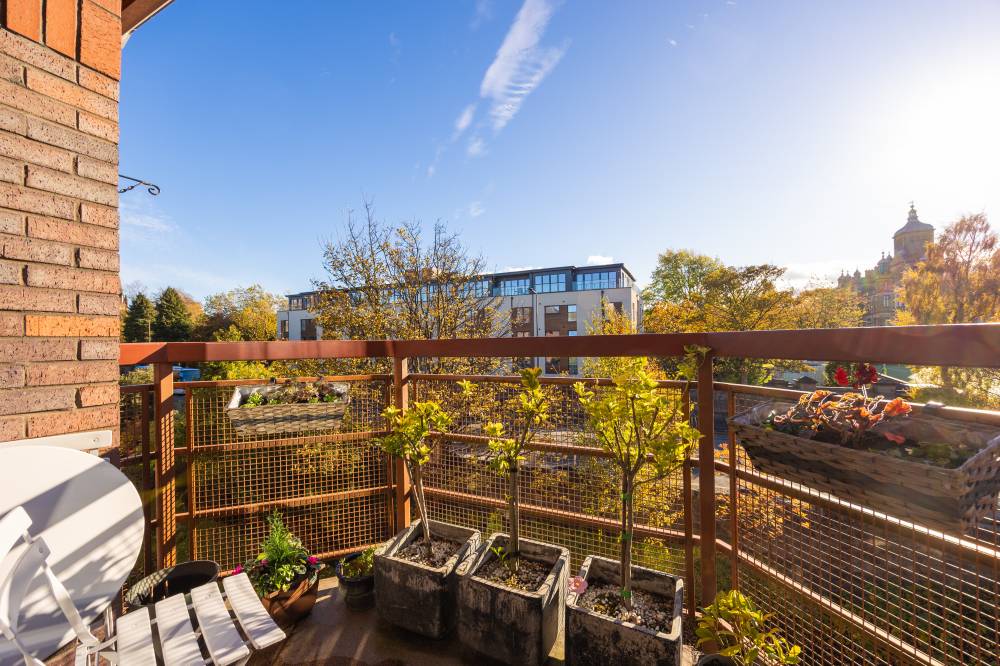 The accommodation opens into a welcoming hallway with built-in storage, leading to a wonderful and spacious reception room. This bright living area is enhanced by a south-facing balcony and an additional window, flooding the room with natural light. The space offers ample room for a family dining table, a built-in electric fire, and laminate flooring throughout, creating a stylish and comfortable living environment. The kitchen is fitted with a comprehensive range of wall and base units and includes integrated appliances comprising a fridge freezer, five-burner gas hob, oven, microwave, dishwasher, and combi washer dryer. The apartment features three generously proportioned double bedrooms. The principal bedroom enjoys an open outlook, mirror-fronted built-in wardrobes, and a modern en-suite shower room. The two further bedrooms also feature built-in wardrobes, carpets, and open outlooks. The modern family bathroom is fully tiled, including the floor, and comprises a white three-piece suite with a dual thermostatic shower over the bath. A particularly useful feature of the apartment is the generous, extensively floored attic, providing further storage space. This exceptional penthouse apartment combines stylish contemporary living with a prime location, offering superb views to Stewart Melville College to the front and Fettes College to the rear.