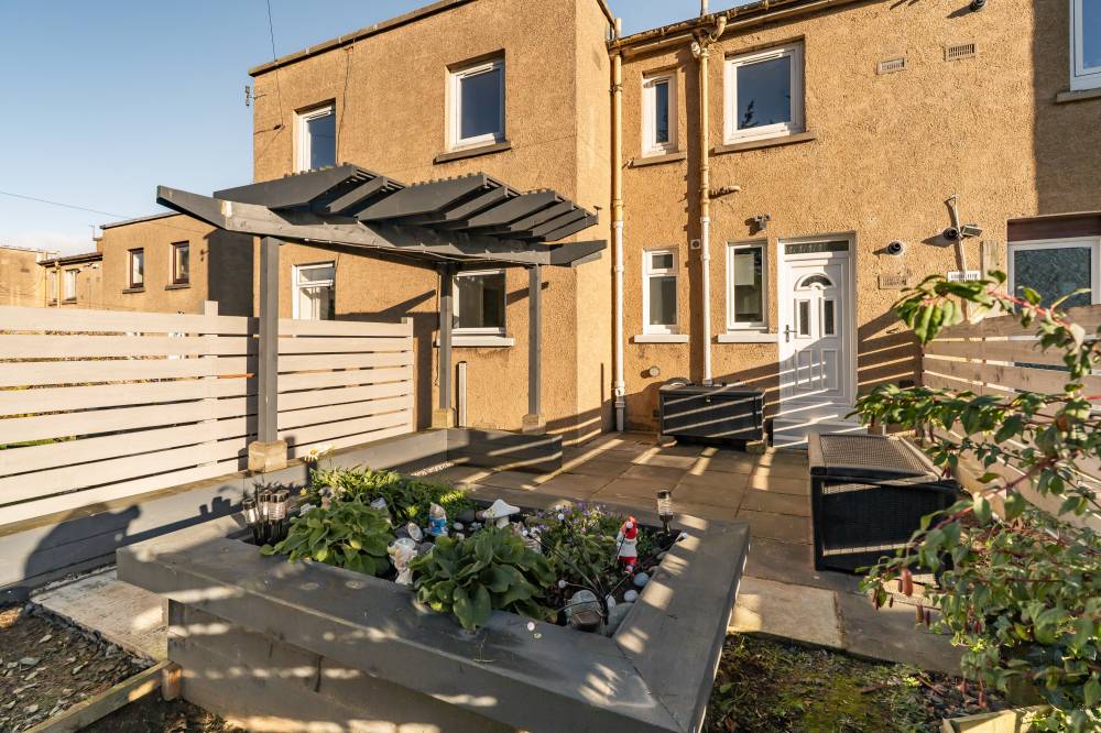 Externally, the property features a front lawn bordered by a hedgerow and a driveway providing off-street parking. The rear garden offers a patio area with a pergola, a lawn, and a timber shed, creating an attractive and private outdoor space for relaxation and entertaining.