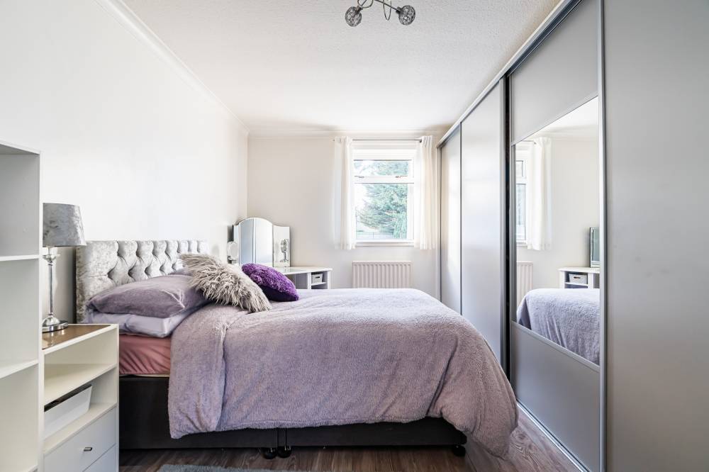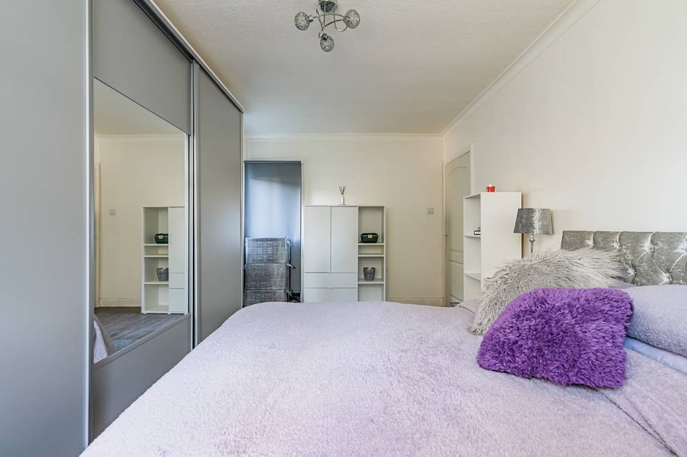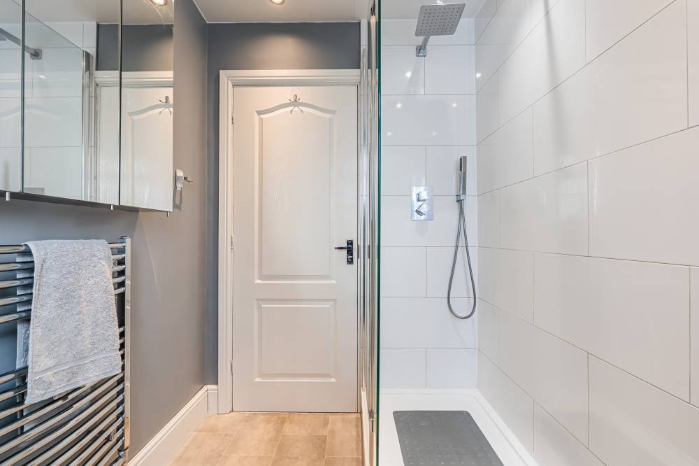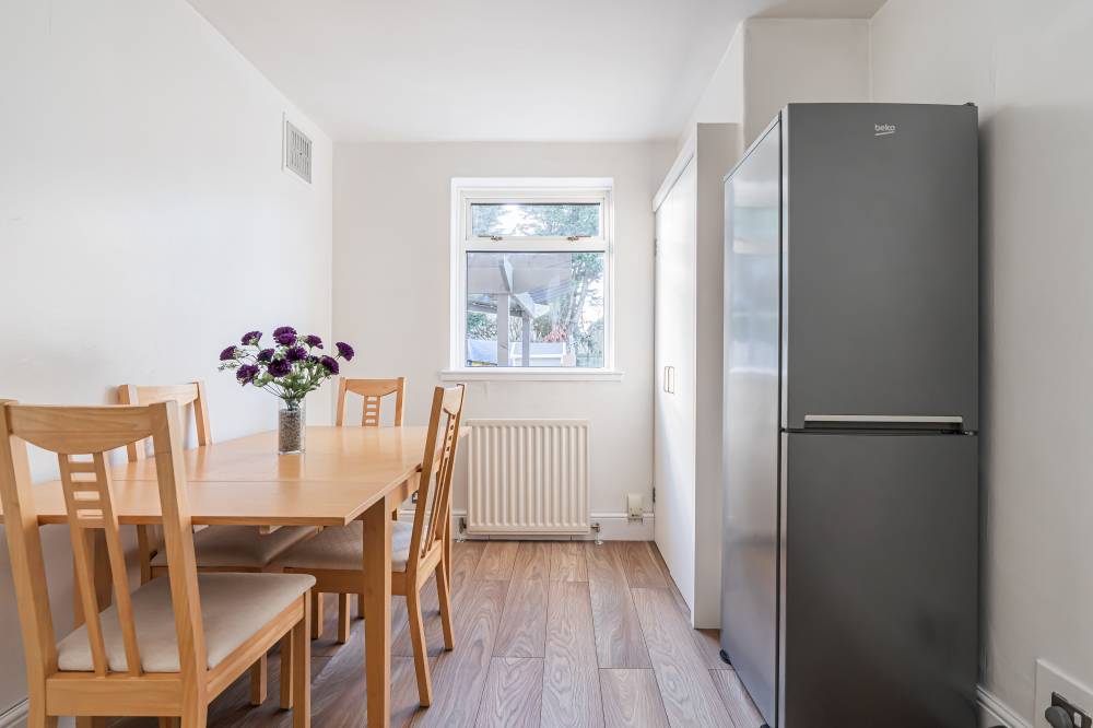 The property is entered via a welcoming hallway with convenient storage. The front-facing reception room is spacious and filled with natural light from a large window, complemented by laminate flooring, creating a comfortable and inviting living space. The galley-style kitchen is located to the rear and features high-gloss white wall and base units, mosaic tiling to splash areas, integrated appliances, and a rear door providing direct access to the garden. The principal bedroom enjoys a dual-aspect outlook to the rear and side, and benefits from built-in storage and fitted wardrobes. The second rear-facing bedroom is flexible in use and is currently arranged as a dining room, while a further double bedroom to the front also includes built-in wardrobe space. The modern shower room is part-tiled and fitted with a crisp white two-piece suite, a walk-in cubicle with a thermostatic rainfall shower, and a heated chrome towel rail.