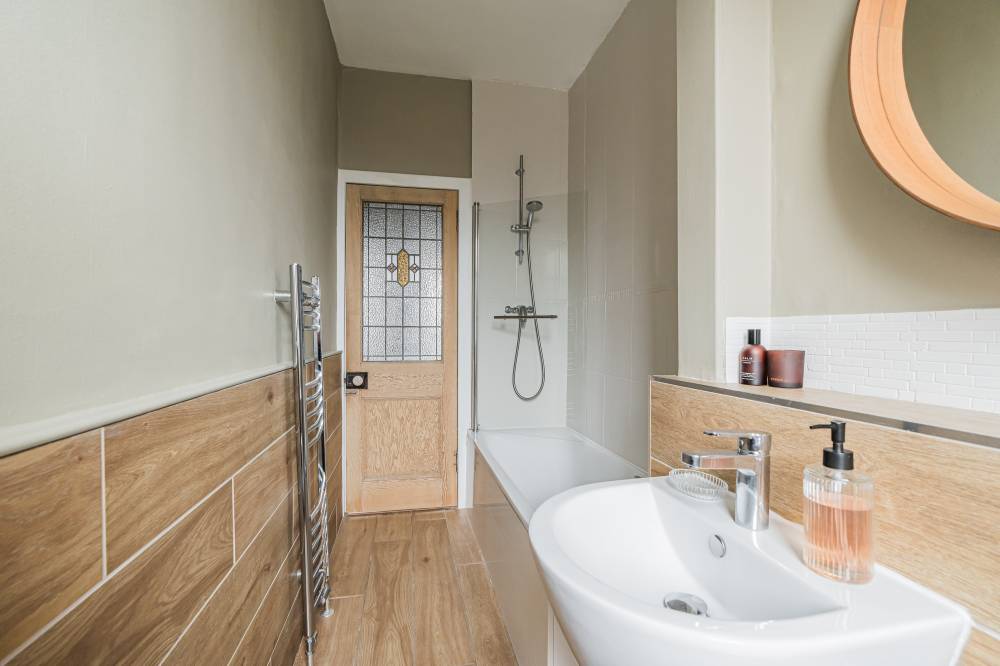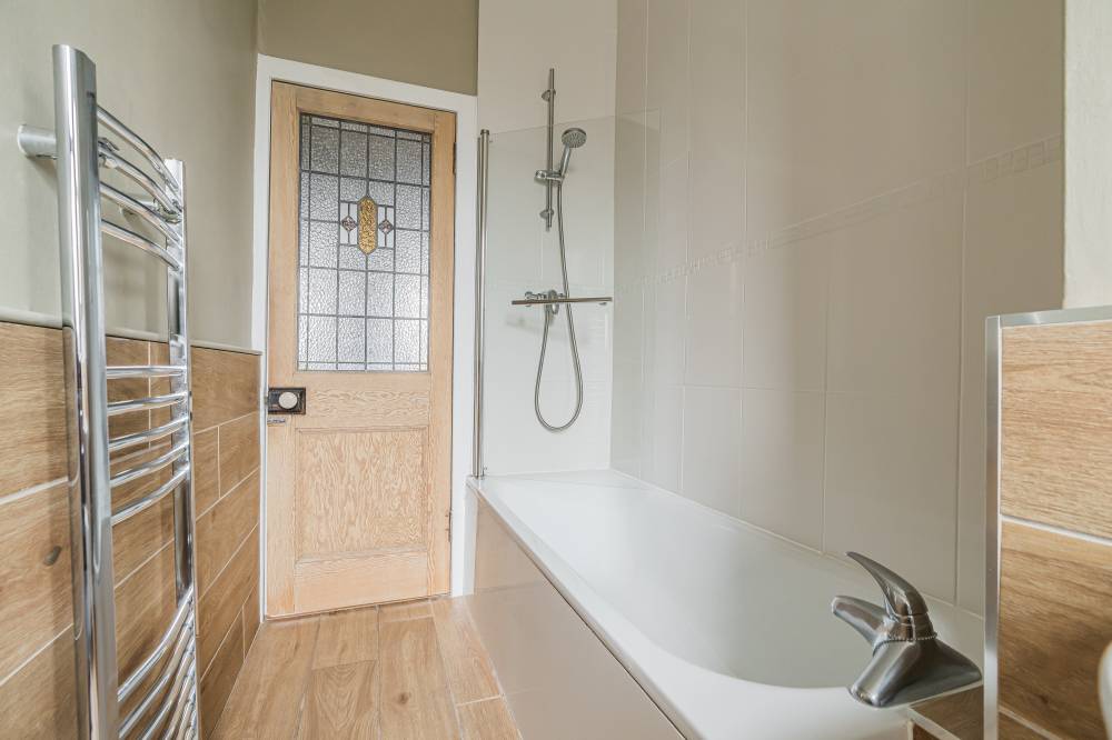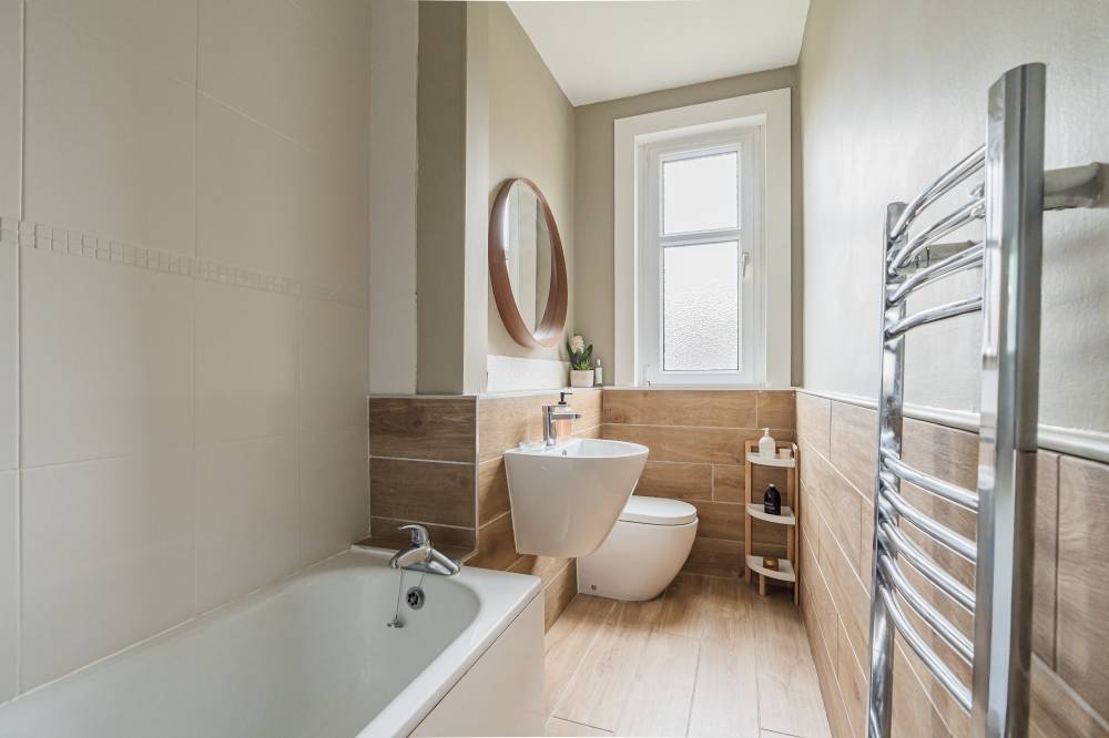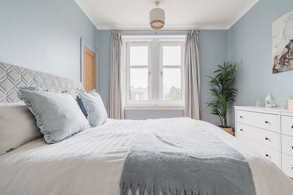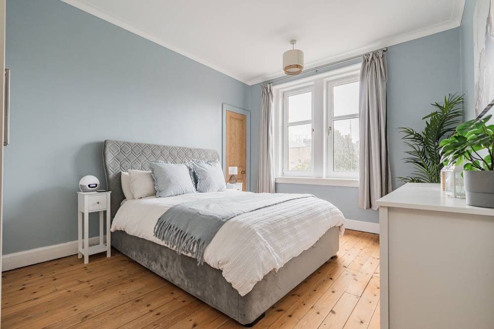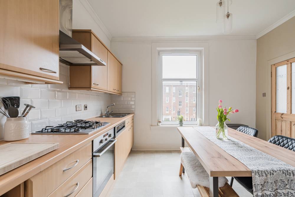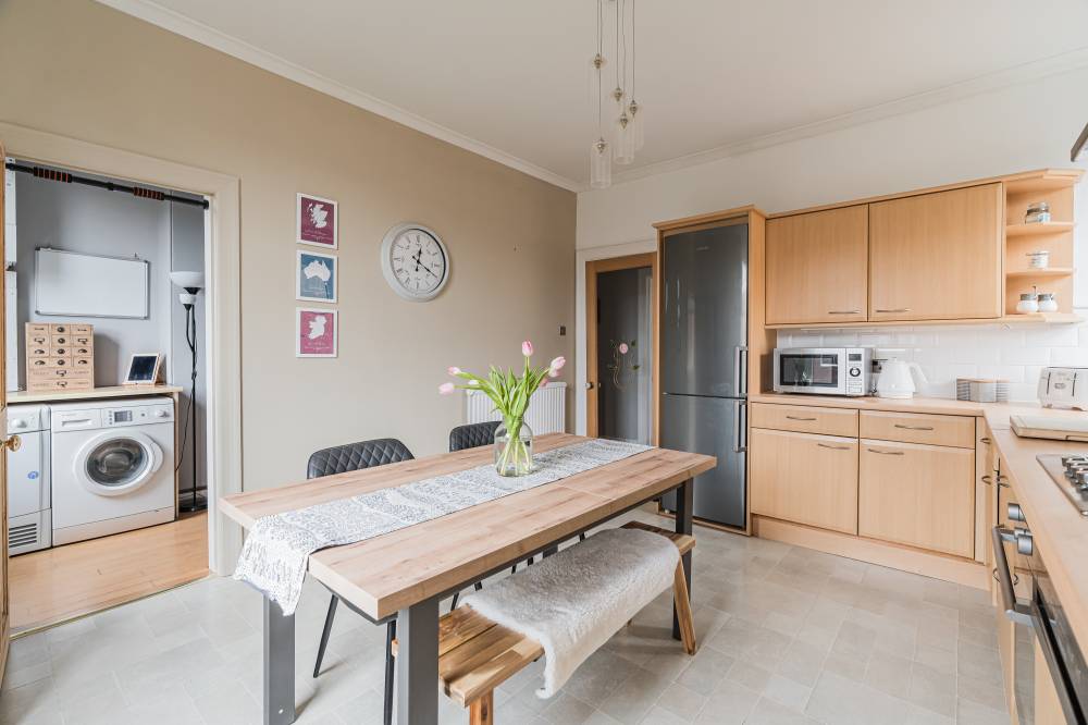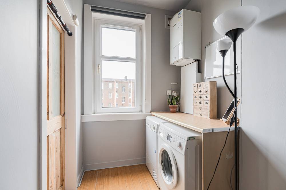 The accommodation is entered via a welcoming hallway with wood flooring and abundant storage options. The striking bay-windowed reception room benefits from a dual aspect, flooding the space with natural light. It features sanded original hardwood flooring, a focal feature gas fireplace with surround, two classic Edinburgh Press cupboards, and period details including a ceiling rose and decorative cornicing. The well-appointed dining kitchen offers a range of fitted wall and base units, integrated appliances, and tiled splashbacks. Adjacent to the kitchen, a separate utility room provides practical space for laundry and a potential home office. The principal bedroom is generously proportioned with wardrobes and additional storage, while the second double bedroom is comfortable and neutrally decorated. A stylish bathroom completes the accommodation, fitted with a white three-piece suite, thermostatic shower over the bath, and a heated chrome towel rail.