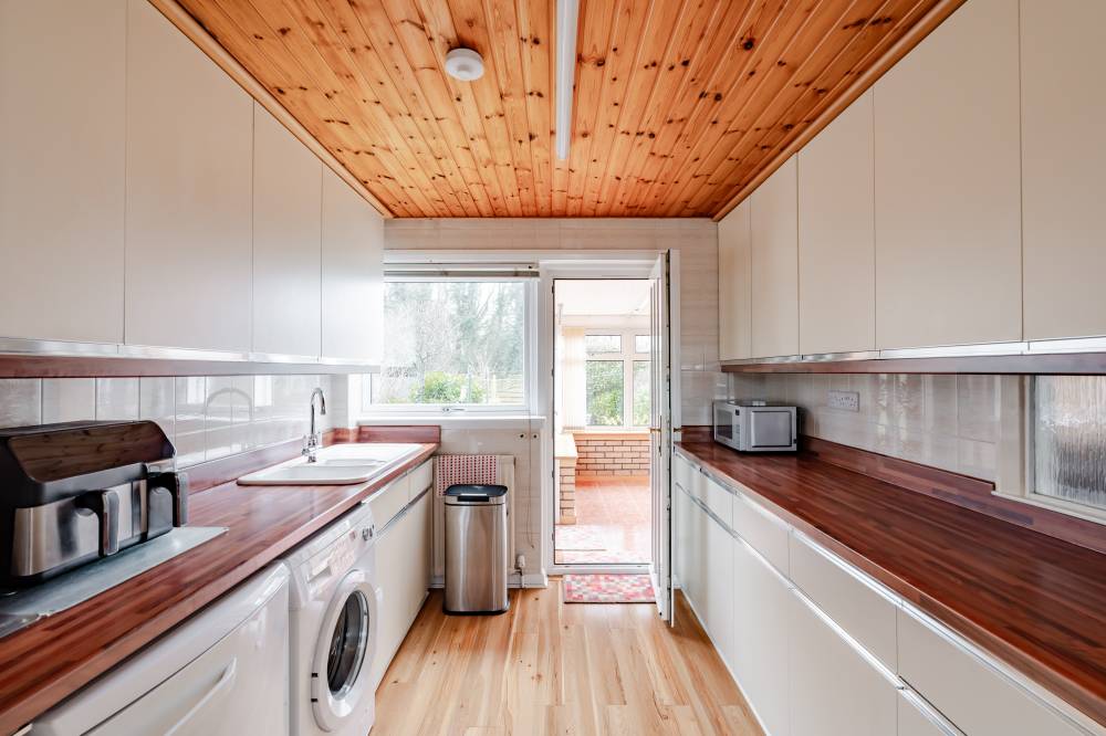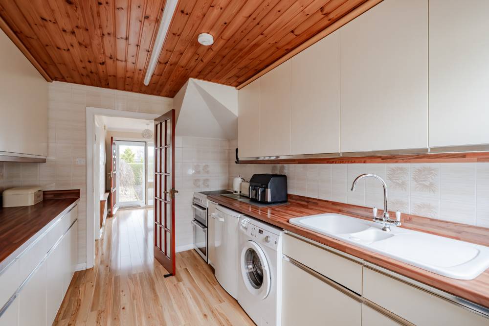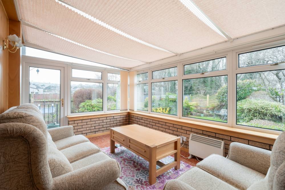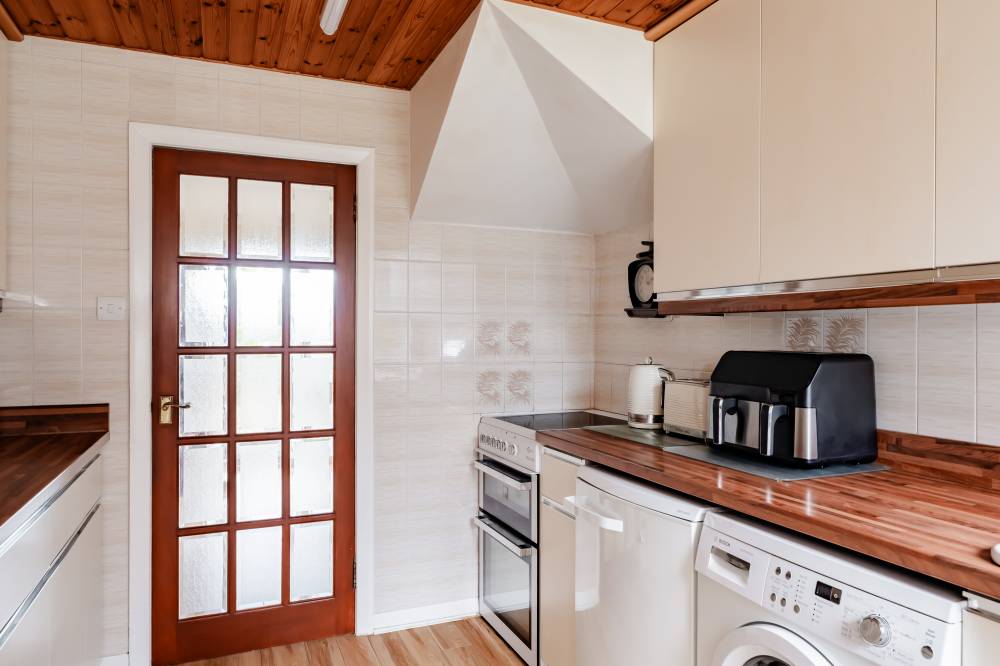 The accommodation is accessed via a welcoming porch leading to a central hallway with staircase. The front-facing reception room opens through a square archway into a rear dining room, providing an inviting flow for family living and entertaining. The galley-style kitchen is fitted with ample wall and base units and space for free-standing appliances. Beyond the kitchen, a rear conservatory offers garden access and provides a versatile living space suitable for use throughout the year. On the upper floor, the property comprises two double bedrooms and a generous single. The principal bedroom overlooks the rear garden and woodland and benefits from built-in wardrobes and carpeted flooring. The second double bedroom is positioned to the front, with carpet and mirror-fronted built-in wardrobes. The third bedroom is a generous single with full-height, full-length built-in wardrobes and additional storage, which could easily be converted into a double with removal of the existing wardrobes. The fully tiled bathroom features a white three-piece suite with a built-in WC and wash hand basin in a vanity unit, complemented by a separate glass cubicle with a Mira electric shower.