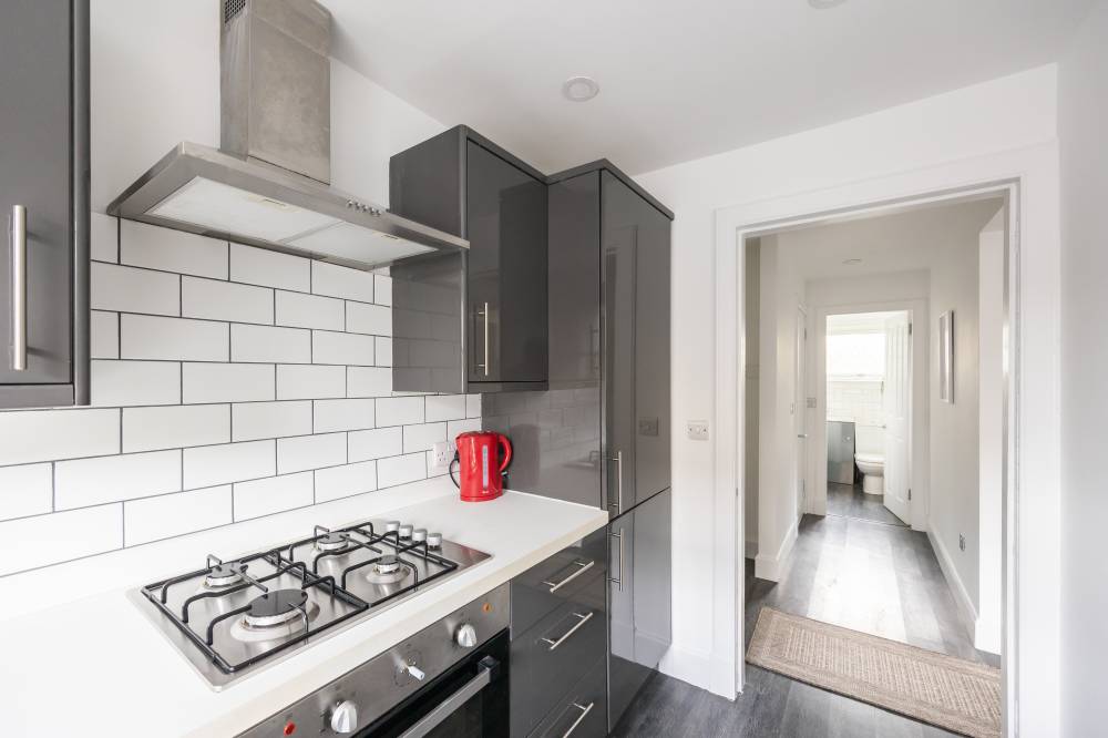 The welcoming entrance hallway provides a useful storage cupboard housing the boiler. A bright and spacious lounge/diner to the rear offers excellent flexibility for furniture layouts, creating the perfect space for relaxing or entertaining. The stylish kitchen is fitted with a range of integrated and freestanding appliances, featuring sleek dark grey gloss cabinetry, and metro-tiled splashback for easy upkeep. The generous double bedroom benefits from an integrated wardrobe and ample room for freestanding furniture, while the modern bathroom is finished with partial tiling and includes a shower over the bath.