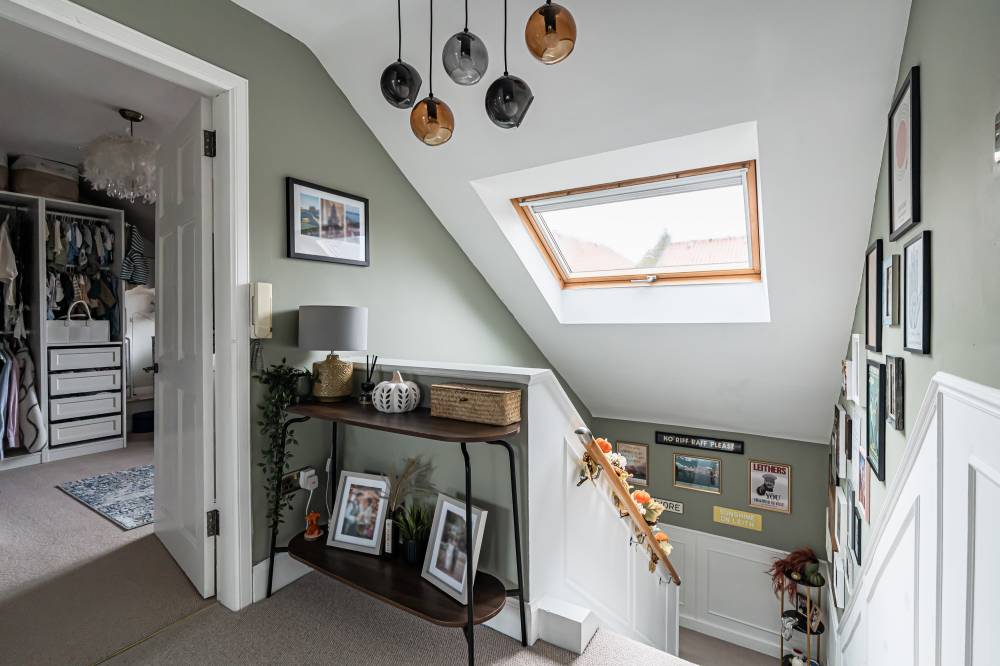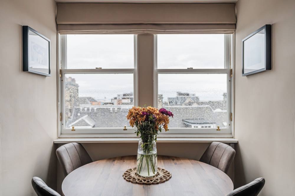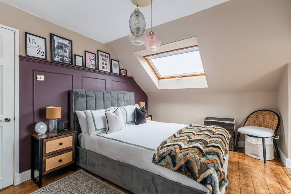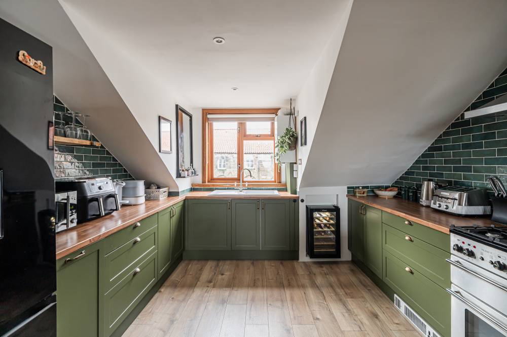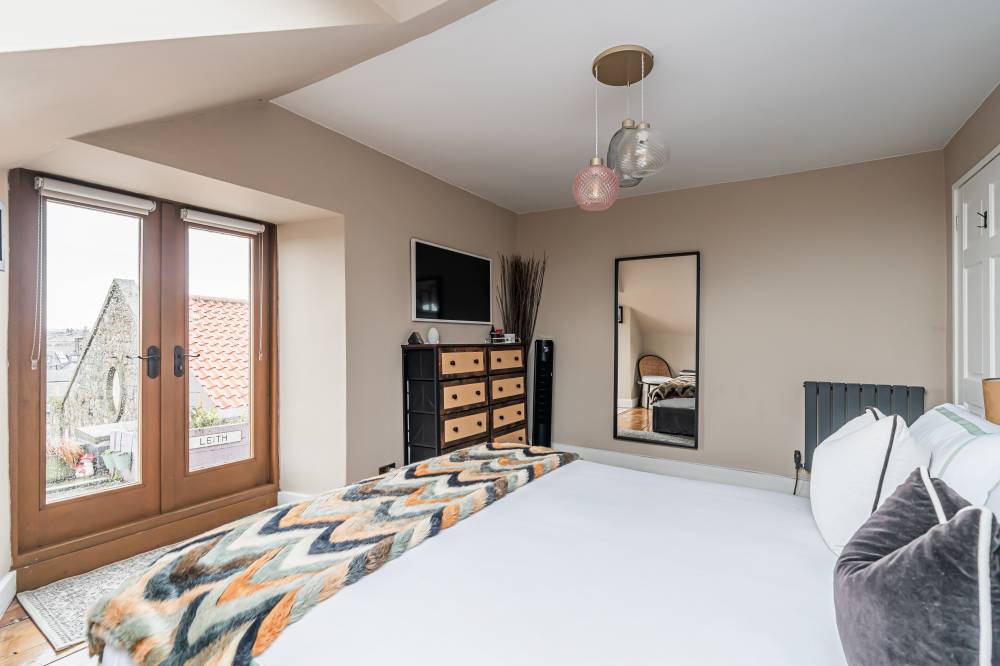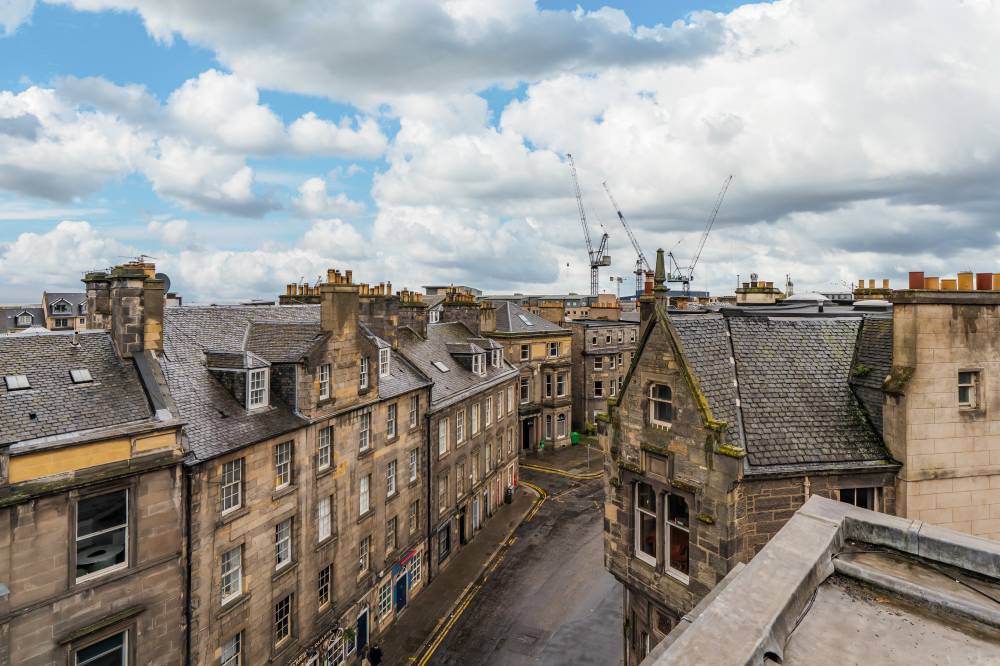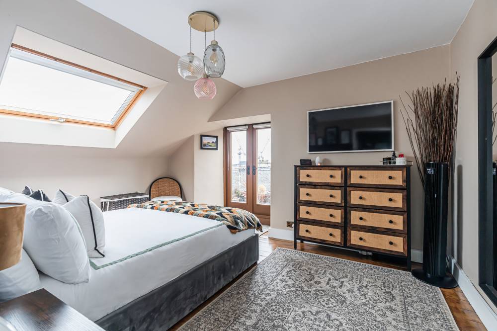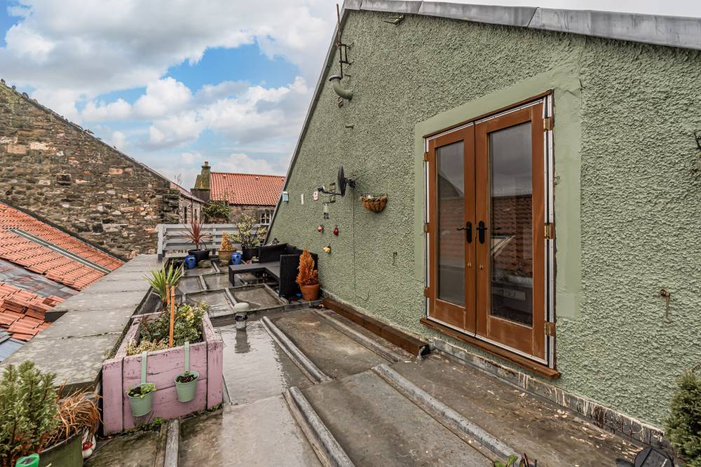 From the secure entrance and communal hallway you enter on the third floor with entrance vestibule and bedroom three which has a built in wardrobe and storage cupboard, and would make an ideal guest bedroom being on its own level. Carpeted stairs lead up to a naturally lit landing and straight ahead is the striking lounge/dining room with views to the Firth of Forth, and is open plan to the modern fitted kitchen with a range of base units with wooden worktops and subway style tiling. The principal bedroom has a velux window and doors opening onto roof space, whilst bedroom two benefits from eaves storage. The luxurious bathroom has a velux window, inset overhead rainfall shower, heated towel rail and underfloor heating. A floored attic with light provides a useful storage space and the property also benefits from gas central heating and double glazing (with the exception of bedroom three).