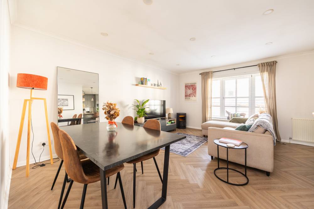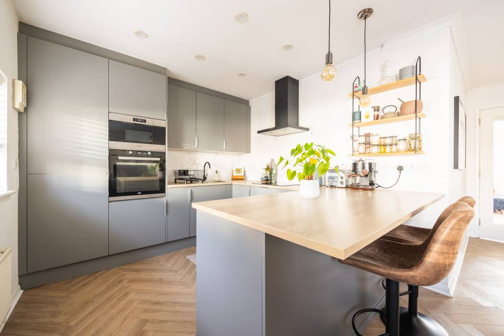 Upon entering, a welcoming hallway gives access to all accommodation and features useful built-in storage, providing a practical and tidy introduction to the home. The heart of the property is the impressive open plan living, dining, and kitchen area, a bright and spacious setting that’s ideal for both everyday living and entertaining. The room is enhanced by contemporary herringbone flooring and tasteful décor, creating a warm and sophisticated atmosphere. There is ample space for comfortable lounge furniture as well as a dining table and chairs, making it perfect for relaxed evenings or hosting guests.