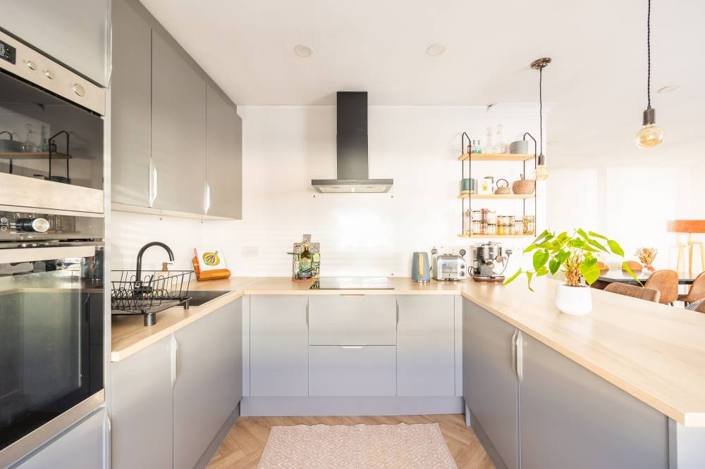 The kitchen area, which has been recently upgraded by the current owner, is a particular highlight. It is fitted with a comprehensive range of soft grey wall and base units, offering excellent storage and complemented by wood-effect worktops and a matching breakfast bar for informal dining. Integrated appliances add to the seamless look and functionality of the space, while the design and layout make the most of both light and space, ensuring an elegant yet highly practical working kitchen.