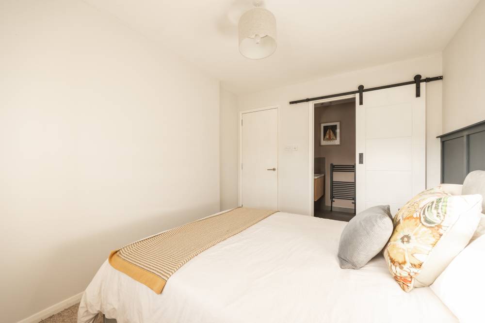 The principal bedroom is a generous double, tastefully decorated in neutral tones and laid with plush carpeting for comfort. It enjoys the luxury of a modern en-suite shower room, which has been finished to a high standard with quality fittings, contemporary tiling, and a sleek glass enclosure. The second bedroom is also a well-proportioned double, again with carpeted flooring and a light, calming décor – making it ideal as a guest room, home office, or additional sleeping space.