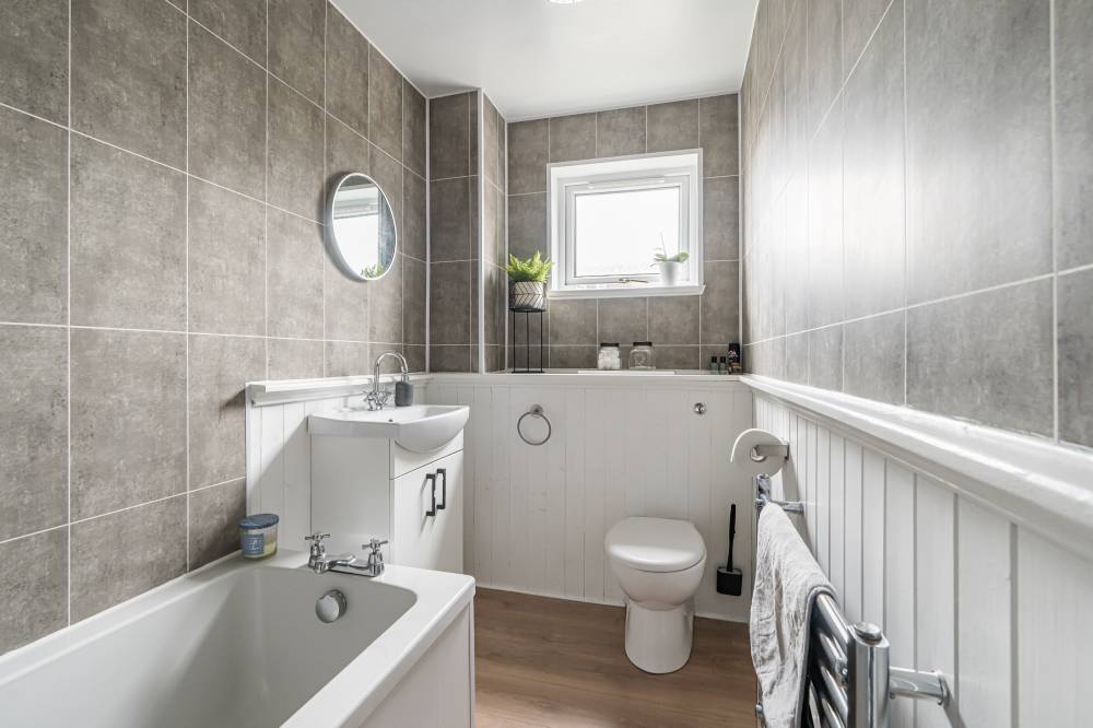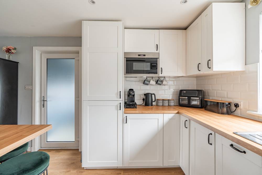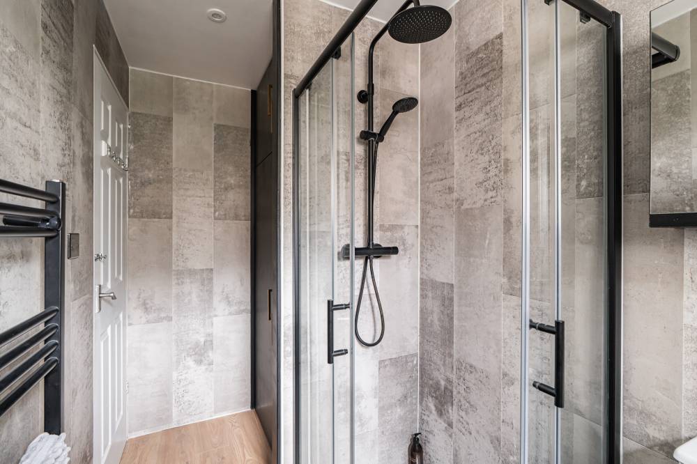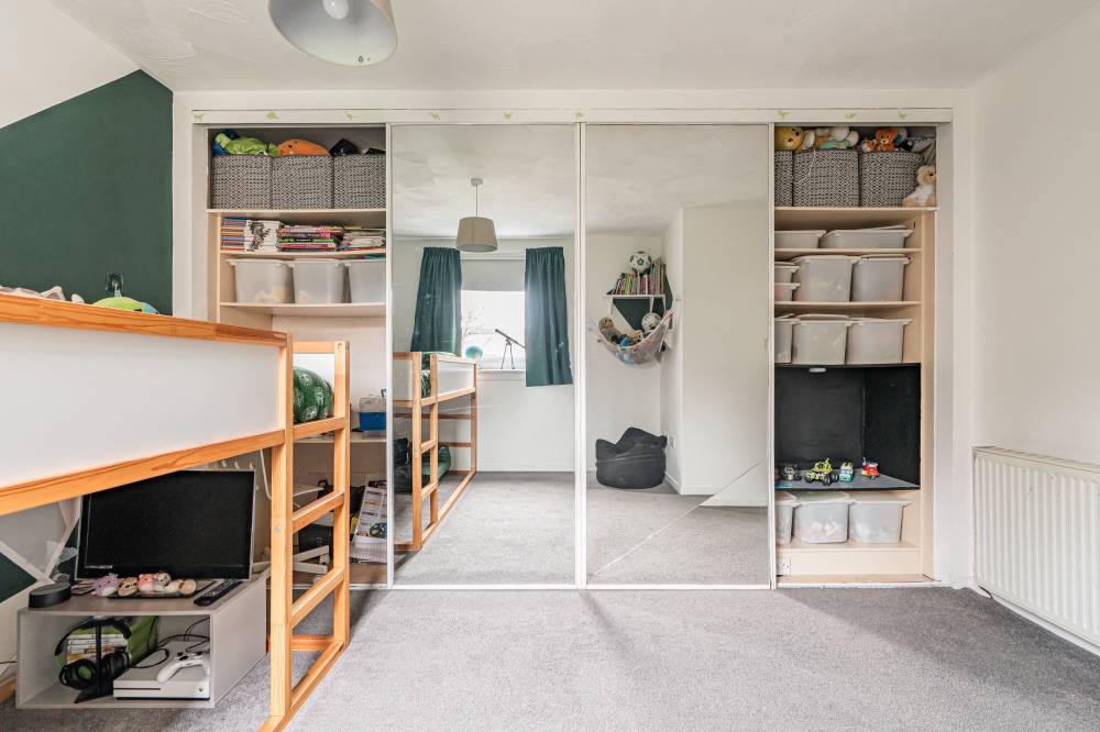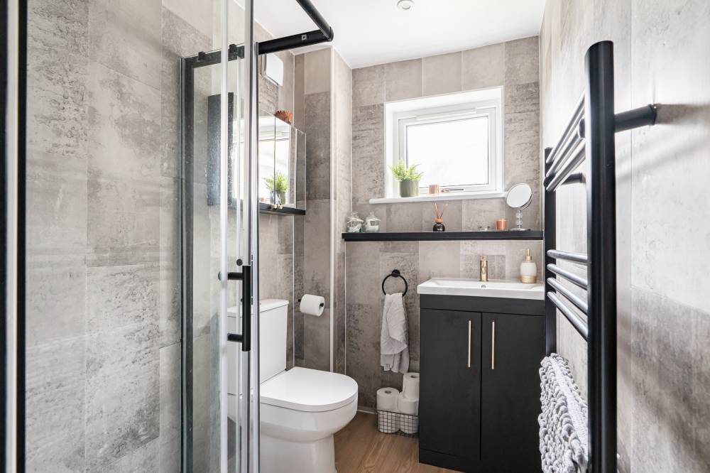 An inviting entrance porch leads into the impressive open-plan lounge, kitchen, and dining area – a bright and sociable space perfect for modern living. The stylish kitchen is fitted with a range of integrated appliances, a practical breakfast bar, and enjoys direct access to the rear via sliding patio doors, creating a seamless indoor-outdoor flow. The ground floor also features a generous double bedroom with wall-to-wall fitted wardrobes and a useful additional cupboard. Completing this level is a contemporary shower room, finished with full panelling, a rainfall shower, and a heated towel rail. Upstairs, the landing houses the boiler cupboard and leads to two further double bedrooms, each benefitting from full-width fitted wardrobes mirroring the style of the ground-floor bedroom. The first-floor family bathroom is fully panelled and includes a shower-over-bath.