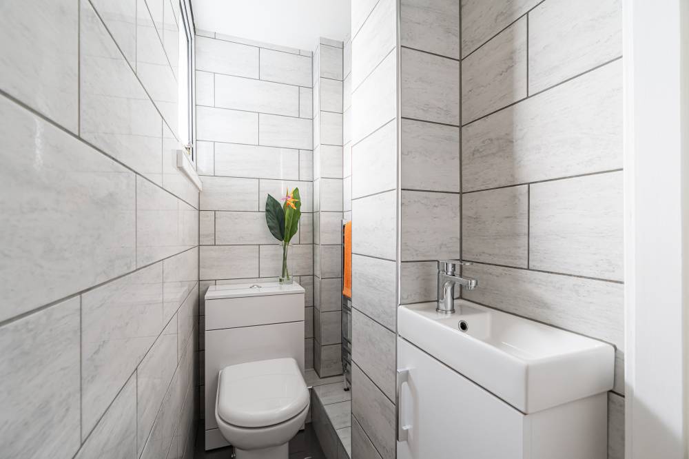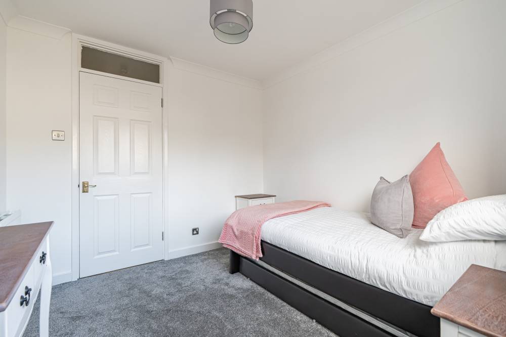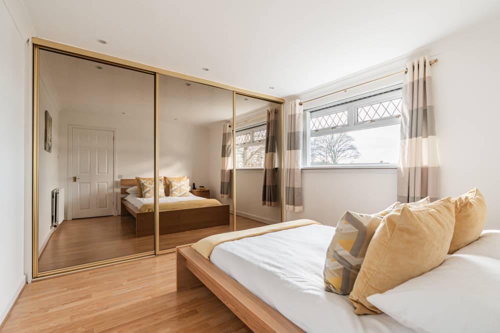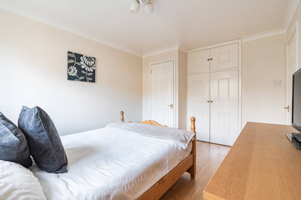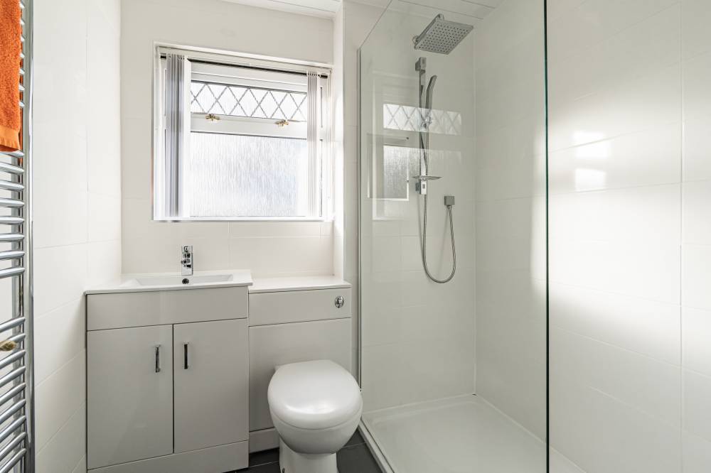 The upper landing features a large storage cupboard and leads to three well-appointed bedrooms. The front-facing principal bedroom is a generous double with wall-to-wall mirrored wardrobes. The second double benefits from a rear aspect, a shelved cupboard, and an integrated wardrobe. Bedroom three is a large single, ideal as a child’s room or optional home office. The fully tiled shower room completes the accommodation, with a walk-in rainfall shower, tiled floor, and heated towel rail.