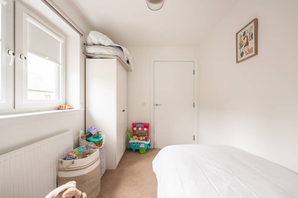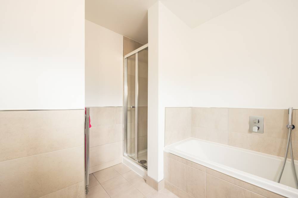 The first floor hosts two good sized bedrooms, each decorated in a calm, modern style and offering excellent flexibility for family life, guests or home working. The landing provides additional storage and opens onto the superb south-facing roof terrace, an ideal spot for morning coffee, afternoon relaxation or sheltered outdoor dining. Completing this level is a stylish family bathroom fitted with a white three-piece suite and a separate shower cubicle.