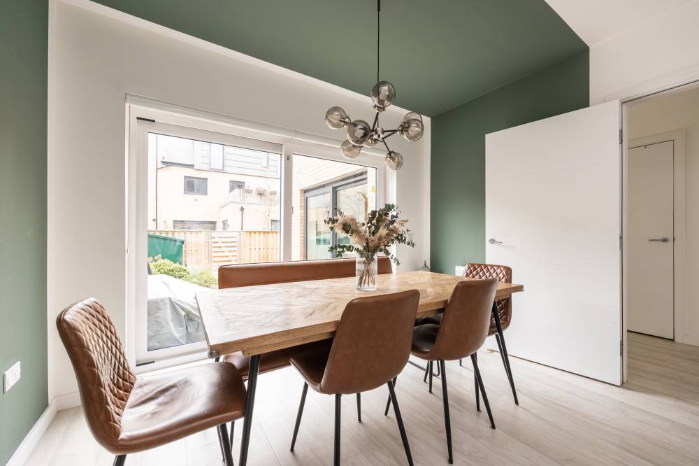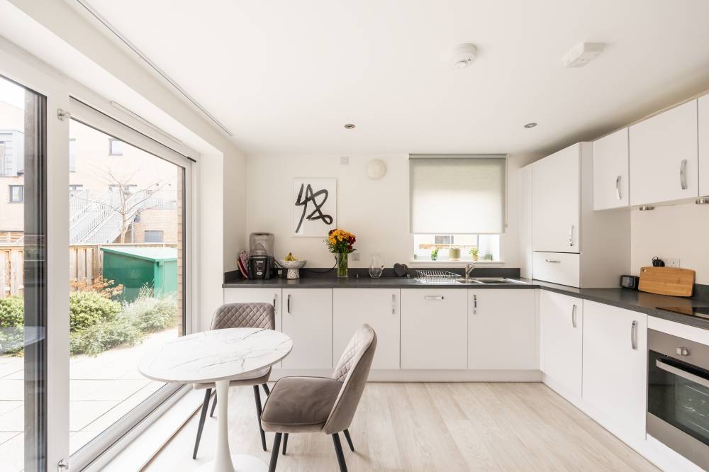 The home opens to a bright and welcoming reception hallway, where a sleek ground-floor WC, a useful utility room and excellent built-in storage ensure practicality from the moment you step inside. To the rear lies the impressive open-plan living and dining area, enjoying a dual-aspect layout that fills the space with natural light. Contemporary décor, generous proportions and glazed doors to the garden create an inviting environment for both everyday living and entertaining. A well-equipped kitchen boasts an extensive range of fitted wall and base units, integrated appliances and attractive tiled splashbacks. Sliding glazed doors lead directly onto the garden, forming a seamless indoor-outdoor flow that is perfect for the warmer months.