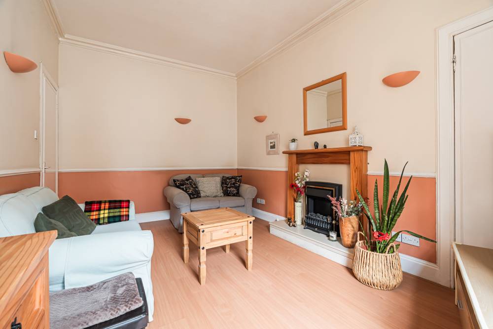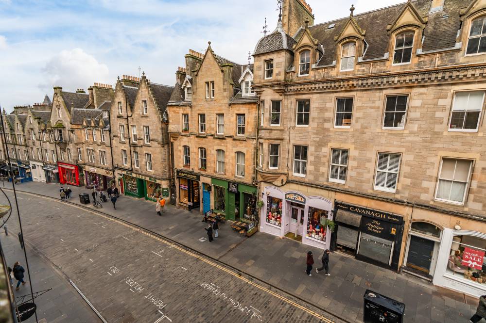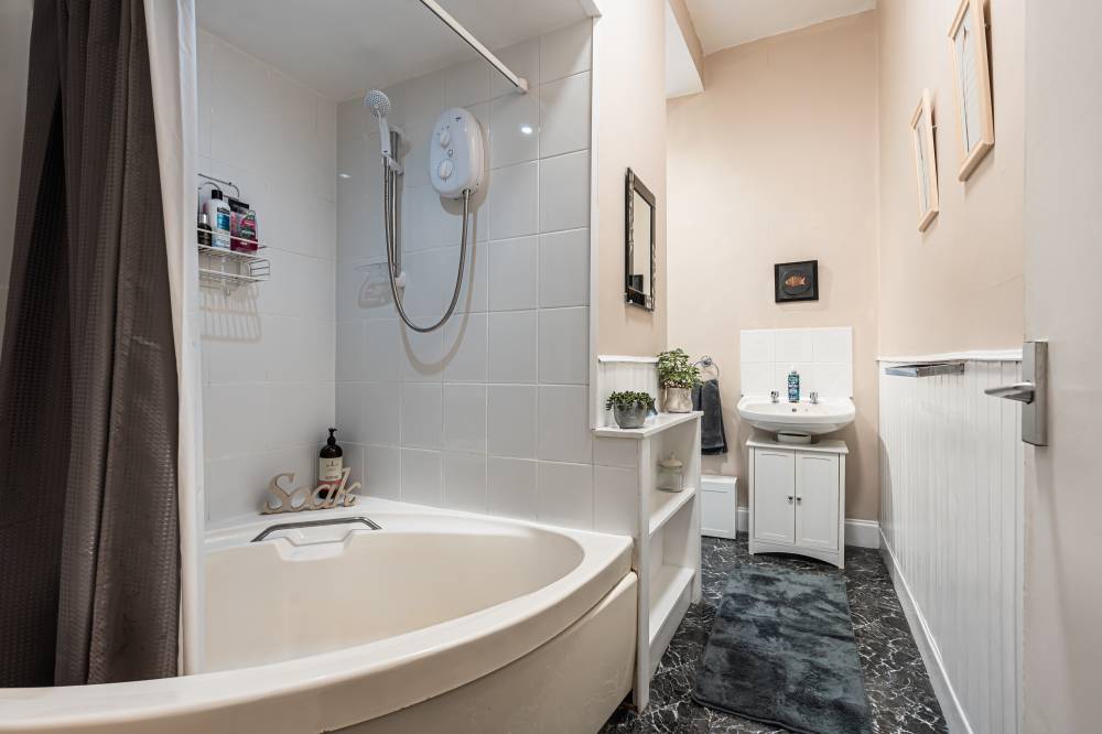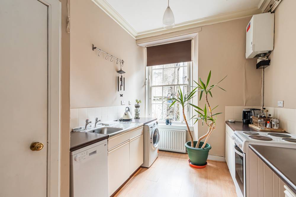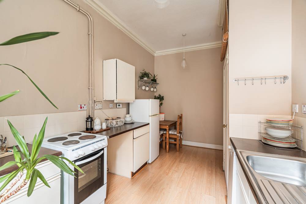 A welcoming entrance hallway provides access to all main apartments. The bright and airy lounge enjoys a pleasant outlook over Cockburn Street and features an electric fireplace along with a traditional Edinburgh press cupboard, creating a warm and characterful living space. The spacious kitchen diner is fitted with a range of freestanding white goods and finished with partial tiling in splash areas for easy upkeep. There is ample space for a dining table and chairs, making this a practical and sociable area for everyday living. The generously proportioned double bedroom benefits from a large built-in cupboard and offers excellent space for freestanding furniture and flexible layout options. Completing the accommodation is the bathroom, fitted with a three-piece suite including a corner bath with shower over.