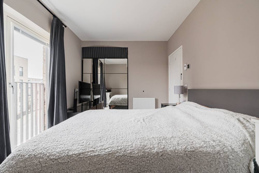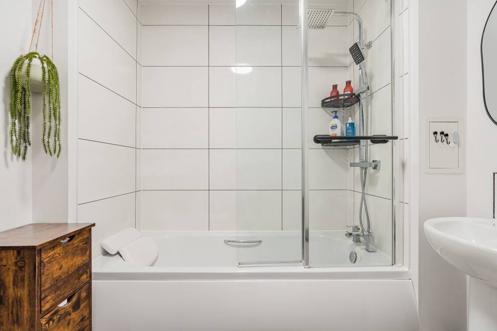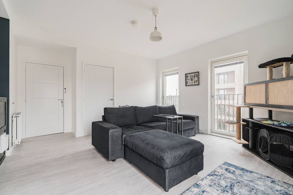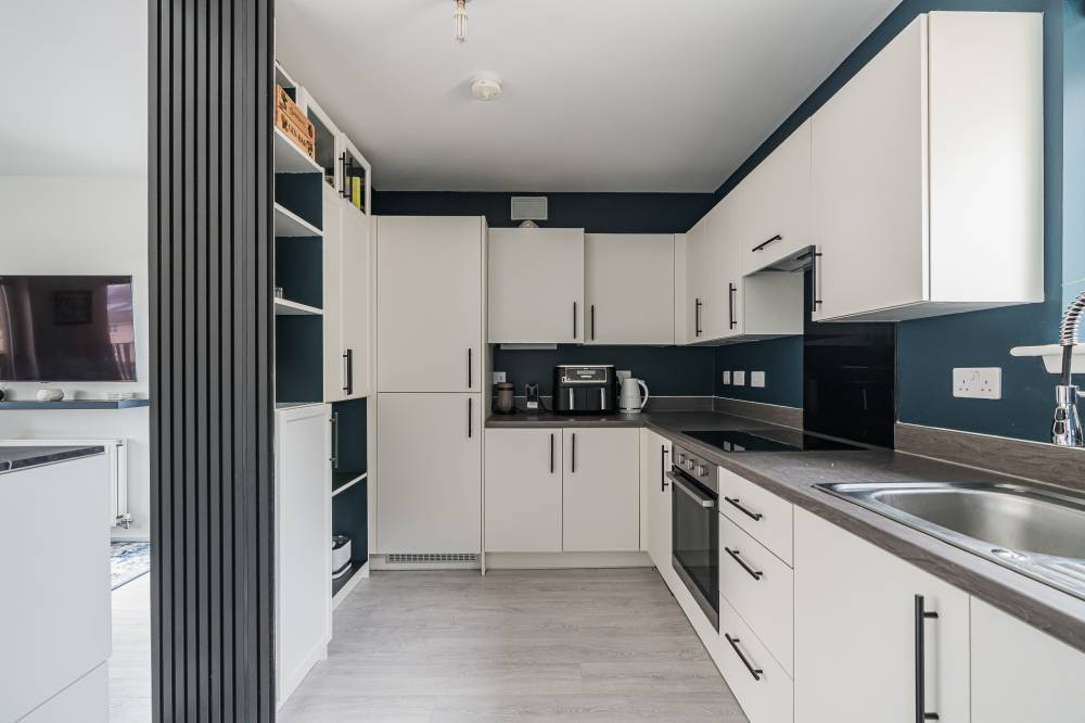 Internally, the flat opens to an inviting hallway which leads to a generous open-plan reception, kitchen, and dining area forming the heart of the home. This bright and versatile space is ideal for both relaxing and entertaining, enhanced by three large windows with Juliet balconies that flood the room with natural light and ample storage, cleverly used as home working space. The modern kitchen is well laid out with ample worktop and storage space and finished in a contemporary style, while the open-plan design comfortably accommodates dining and seating areas. A large walk-in storage room is located off the kitchen which combines a utility room with plumbing for a washing machine. The double bedroom is quietly positioned to the rear, offering a peaceful retreat with mirrored, built-in wardrobes and Juliet balcony with an open aspect outlook. Completing the accommodation is a modern bathroom fitted with a white suite, bath with overhead shower, and stylish tiling.