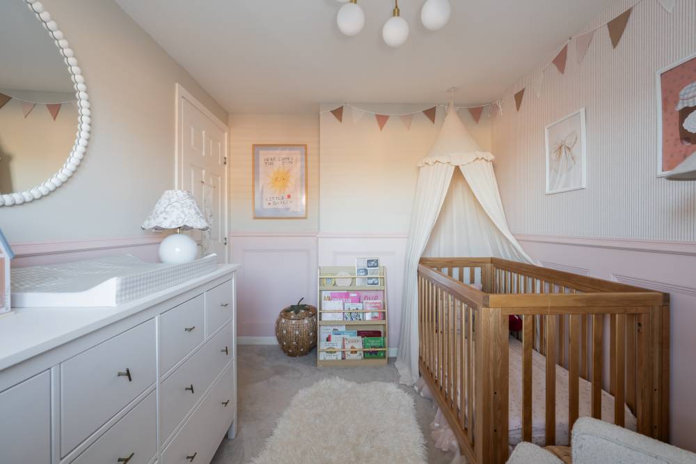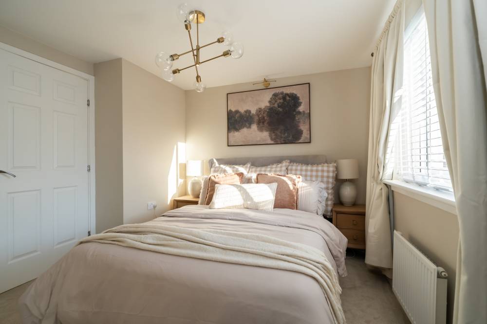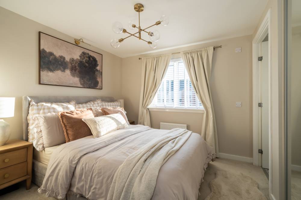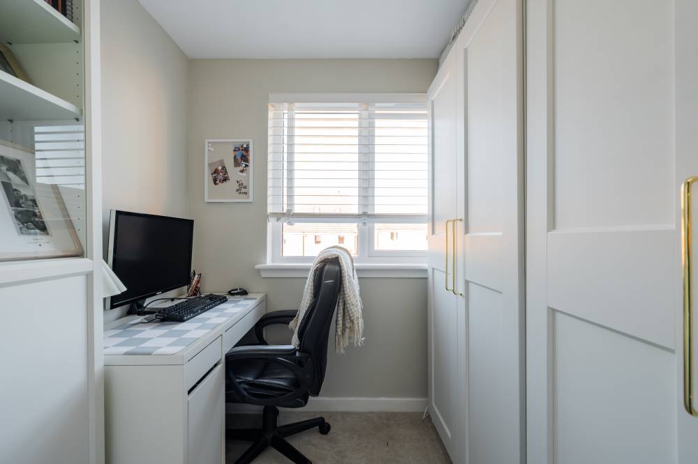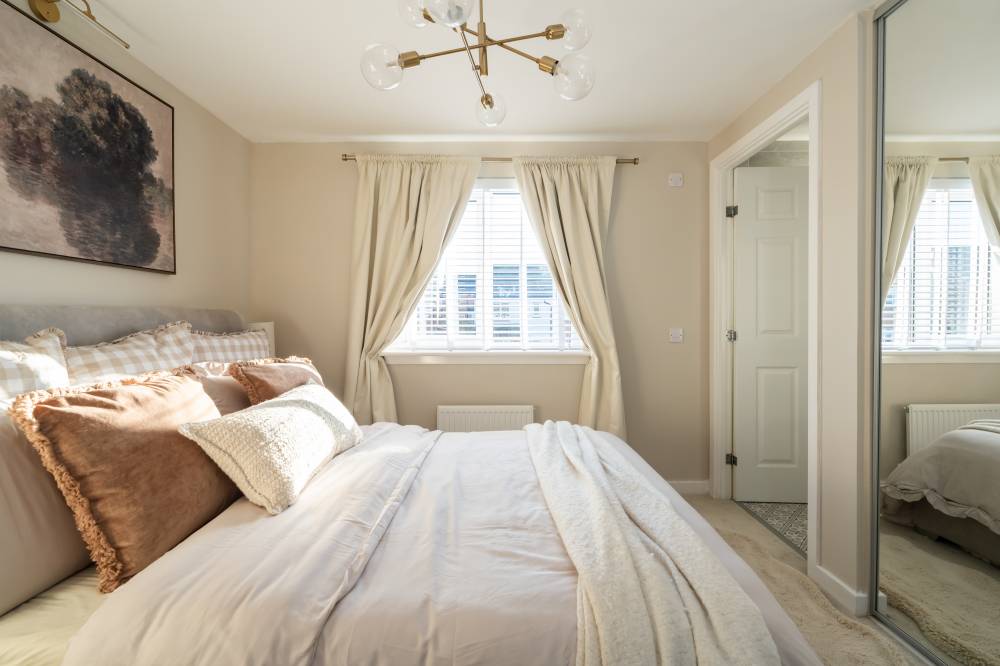 To the rear, the well-appointed dining kitchen is fitted with a range of white wall and base units and includes integrated appliances. Glazed doors open directly onto the rear garden, creating a seamless connection between indoor and outdoor living, while useful under-stairs storage adds to the practicality of the space. The principal bedroom is a generously sized double, featuring mirror-fronted built-in wardrobes and the added benefit of a private en-suite shower room. A further double bedroom enjoys a rear aspect and is finished with carpet flooring and attractive wood-panelled feature walls. The third bedroom is a single room, also positioned to the rear, making it ideal as a child’s room, home office, or nursery.