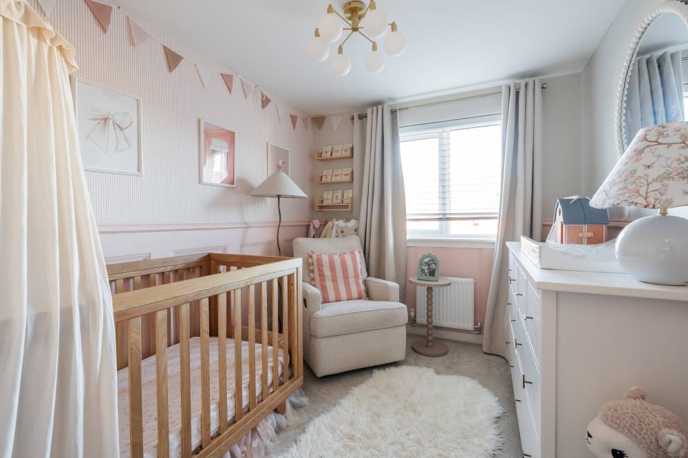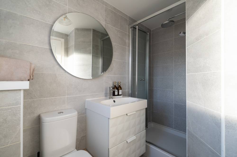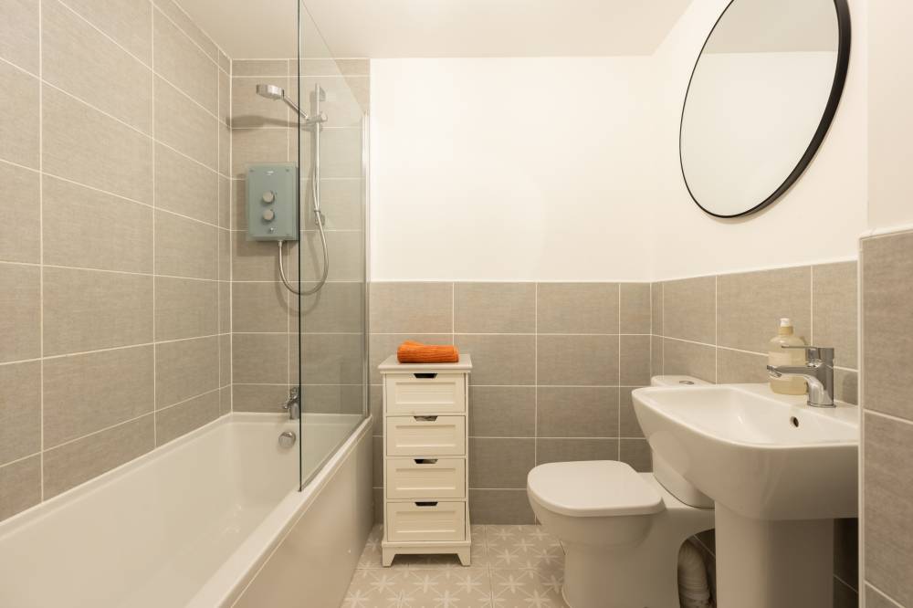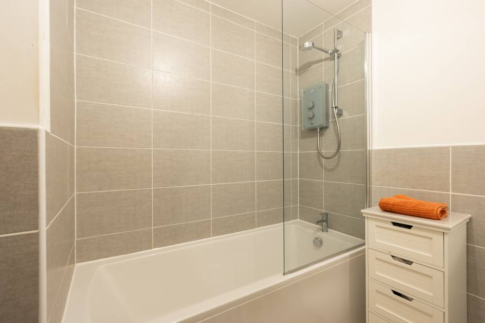 The family bathroom is fitted with a modern three-piece white suite, with an electric shower over the bath.
