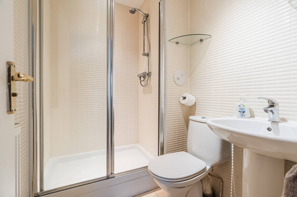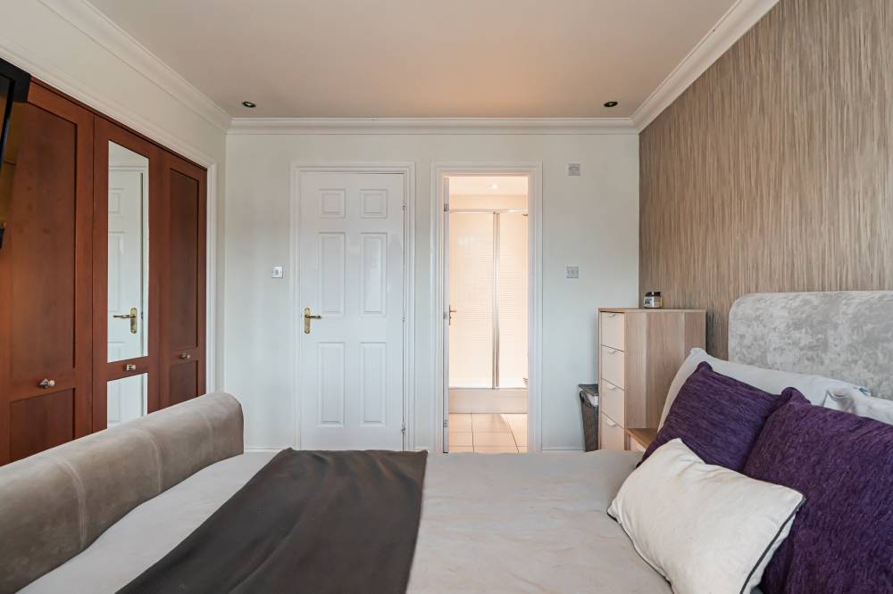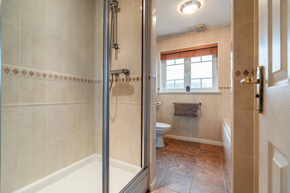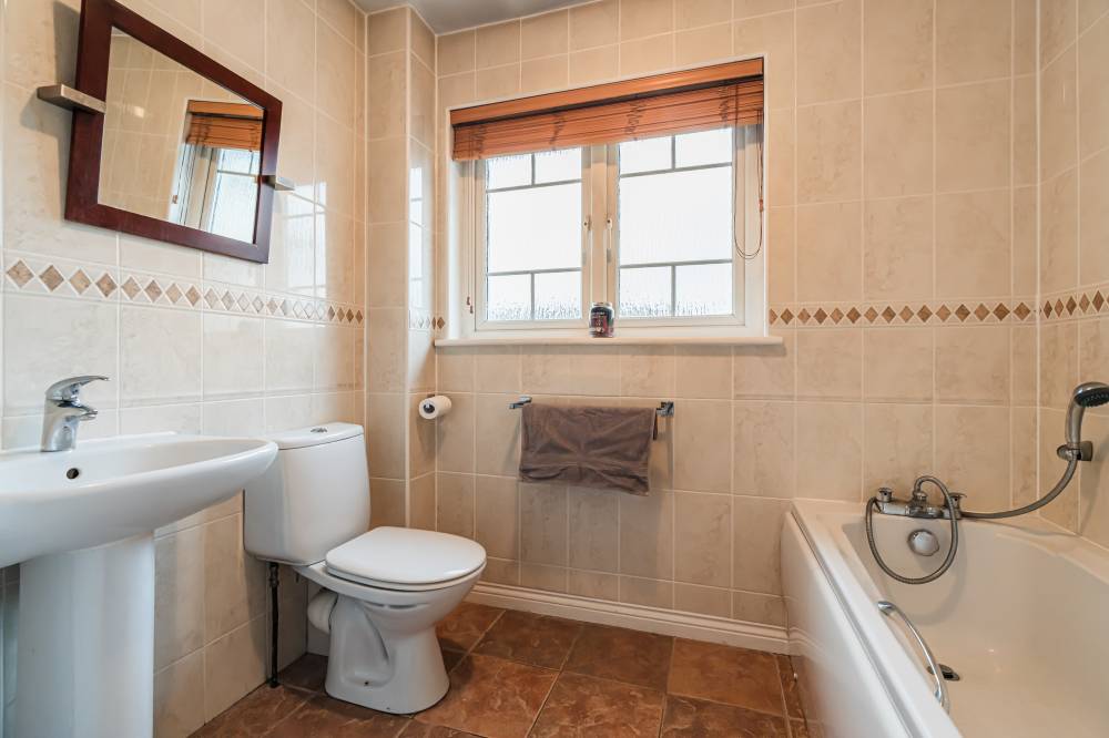 A welcoming entrance hallway provides access to a cloak cupboard and a useful understairs storage cupboard. The bright and airy lounge is rear facing and offers a calm, comfortable space ideal for everyday relaxation. The generously proportioned kitchen/diner forms the heart of the home and is particularly impressive, having been enhanced through the conversion of the former garage to create an exceptional dining and entertaining space. The kitchen is fitted with a range of integrated appliances, complemented by partial tiling in the splash areas. Enjoying a triple-aspect outlook, the room is flooded with natural light and features patio doors opening directly onto the rear garden, making it perfect for family living and social gatherings. Completing the ground floor accommodation is a partially tiled two-piece WC. The upper features the boiler cupboard as well as access to the loft. The principal bedroom is a rear-facing double featuring an integrated wardrobe and an en-suite shower room with tiled flooring, full wall tiling, and a double shower cubicle. Bedroom two is a sizeable front-facing double with an integrated wardrobe, while bedroom three is another well-proportioned rear-facing double, also benefiting from integrated storage. All bedrooms offer ample space for freestanding furniture and flexible layouts. The family bathroom is finished with a separate bath and shower, full tiling, tiled flooring, and a shelved linen cupboard.