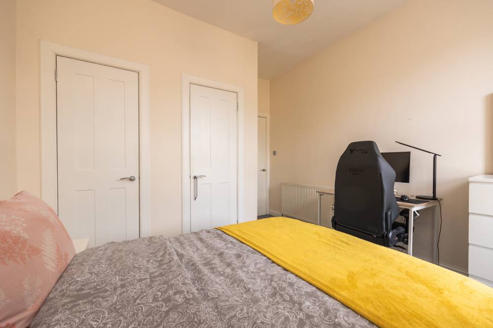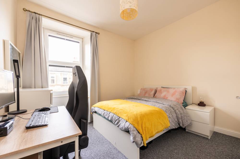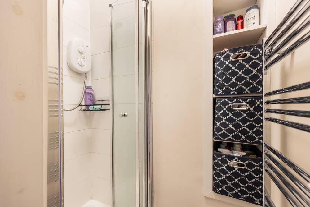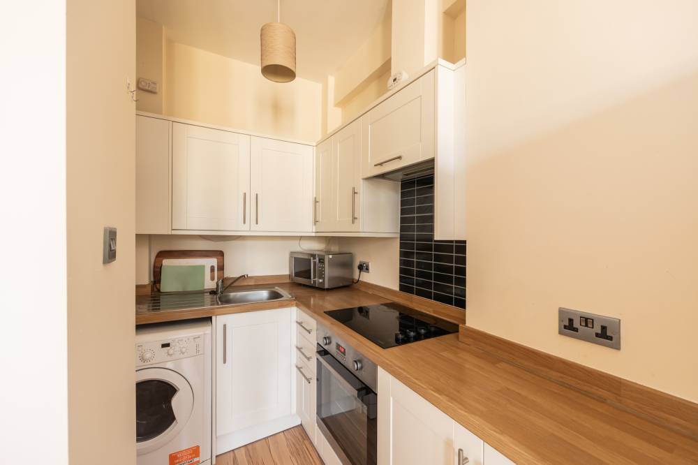 The accommodation is accessed via a welcoming hallway which provides access to a useful meter cupboard and leads through to the main living space. The open plan lounge, kitchen and dining area is bright and well-proportioned, benefitting from twin windows allowing excellent natural light. The kitchen area is neatly arranged and fitted with a combination of integrated and freestanding white goods, complemented by under-unit lighting and a charming Edinburgh press cupboard offering additional storage. The bedroom is a generous double room with a front-facing aspect and benefits from two large storage cupboards/wardrobes, along with ample space for additional freestanding furniture and flexible layout options. The shower room is finished with partial tiling and features built-in shelving along with a heated towel rail, while a separate WC is fitted with a two-piece suite and tiled splashback behind the sink for easy maintenance.
