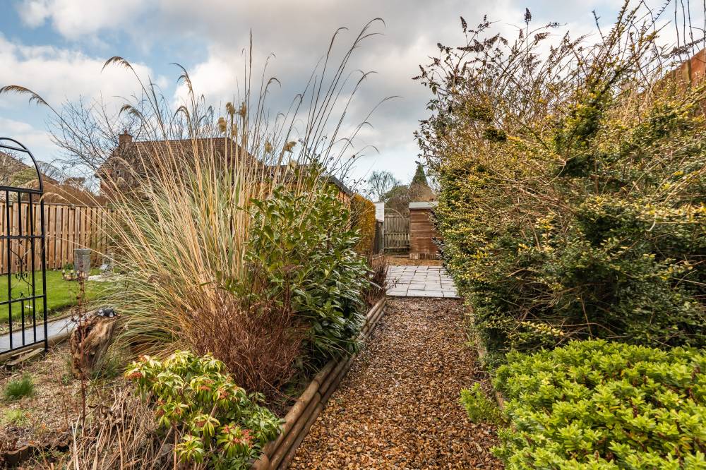 Externally, the property enjoys private gardens to both the front and rear. The front garden is mainly laid to lawn, while the beautifully maintained south-facing rear garden offers a sunny and sheltered space, finished with decorative chippings, a paved patio area and an abundance of established shrubs and plants. A garden shed is included in the sale. To the side of the property there is a shared driveway with two allocated parking spaces, along with a communal drying area to the rear. Further unrestricted on-street parking is available to the front.